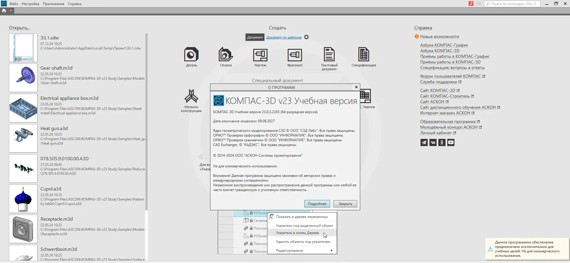 - Учебная версия не поддерживает интеграцию с системами управления данными и содержит водяные знаки при печати