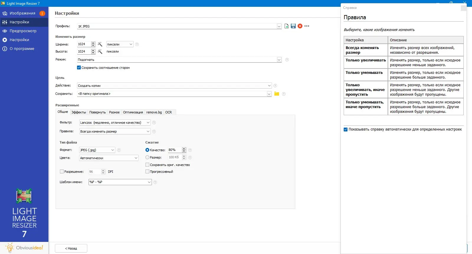 - Гибкие настройки изменения размера и сжатия