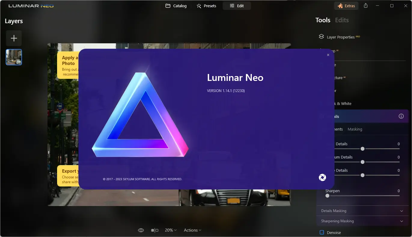 Luminar Neo — современный фоторедактор на базе искусственного интеллекта от компании Skylum, предназначенный для автоматизированной и профессиональной обработки изображений. Программа сочетает в себе передовые технологии анализа сцен, коррекции экспозиции и инструменты для редактирования портретов. Благодаря встроенному ИИ, пользователи получают доступ к расширенным возможностям без необходимости глубоких знаний в области графики.