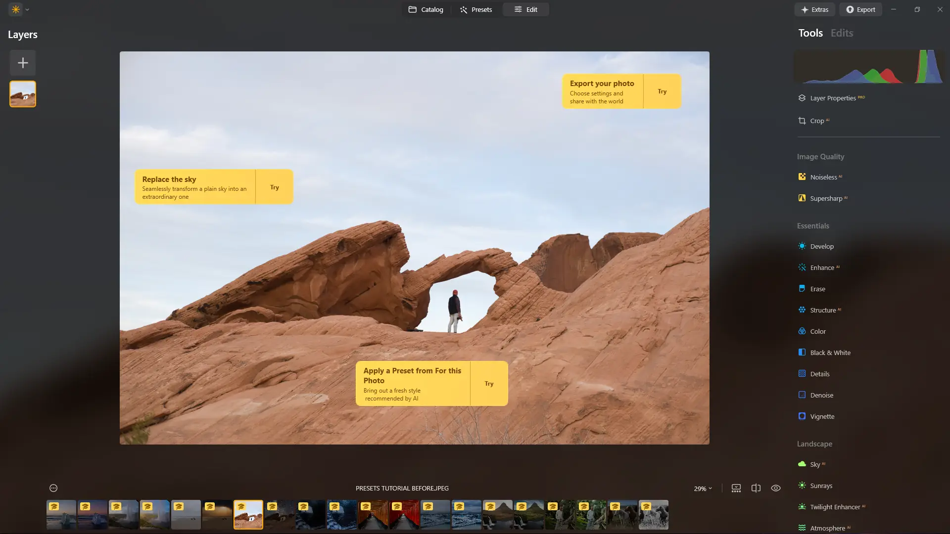 Работа с Luminar Neo начинается с импорта изображений через встроенный браузер или перетаскиванием файлов в рабочую область. Интерфейс разделён на модули: обработка, ретушь, коррекция цвета, замена фона и портретные инструменты. Каждый модуль активируется по мере необходимости, что упрощает навигацию. Пользователь может применять готовые пресеты для быстрого улучшения фото или настраивать параметры вручную, используя слайдеры и маски.