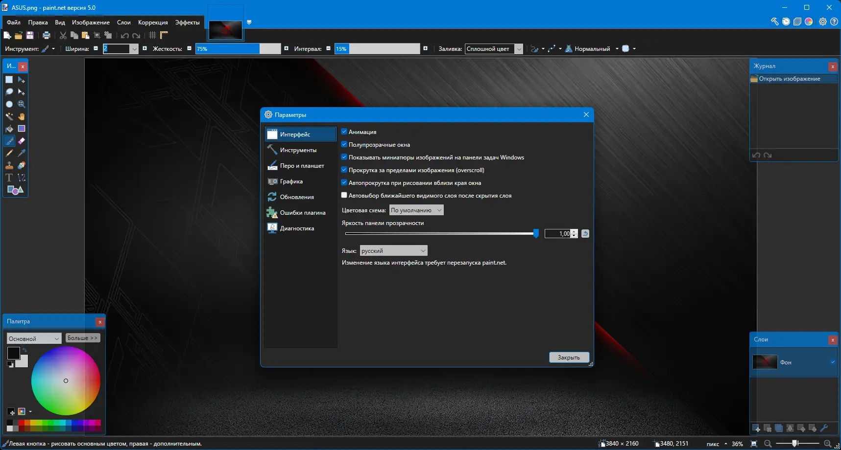 Использование Paint.NET не требует специальных знаний благодаря продуманной логике интерфейса. Новые изображения можно создавать с заданными параметрами или открывать уже существующие файлы с помощью стандартного диалога. Все основные инструменты, такие как кисть, ластик, выделение, заливка и текст, расположены в боковой панели и легко доступны. Для точной настройки применяются параметры кисти, прозрачность слоёв и режимы наложения.