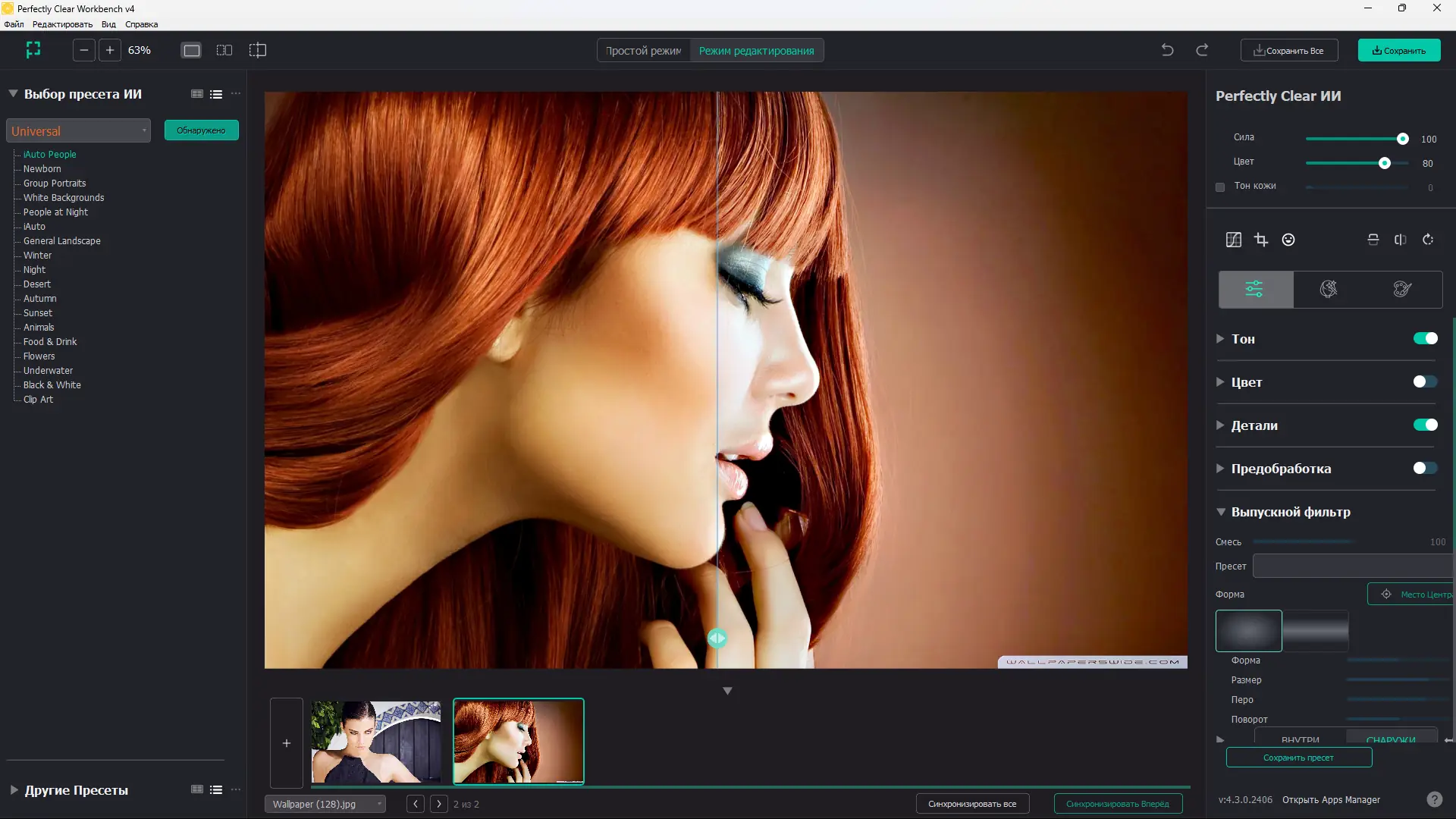 - Автоматическая коррекция изображений с сохранением естественности цветов и деталей.