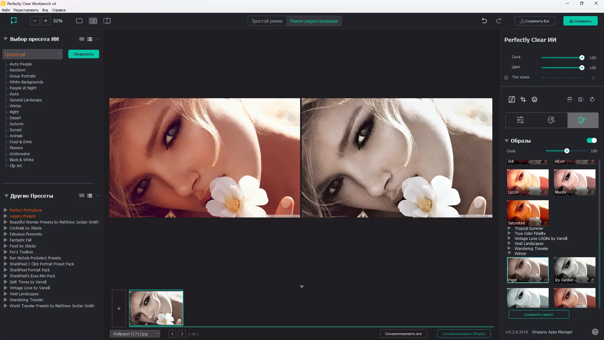 Perfectly Clear WorkBench — мощный инструмент для автоматической и ручной коррекции цифровых фотографий, устраняющий дефекты съёмки и улучшающий качество изображений с помощью запатентованных технологий обработки. Программа эффективно справляется с шумами, засветкой, размытостью, эффектом красных глаз и другими типичными проблемами, возникающими при съёмке. Подходит как для начинающих, так и для профессиональных фотографов, стремящихся быстро достигать высокого качества изображений.