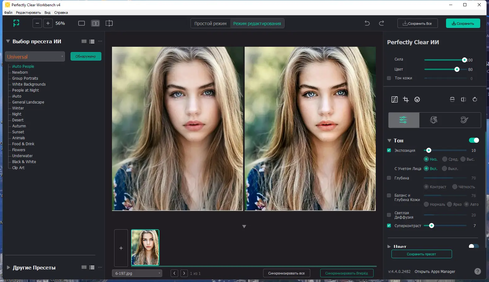 Perfectly Clear WorkBench сочетает в себе простоту интерфейса и глубину функционала, обеспечивая высокое качество обработки без потерь в производительности.