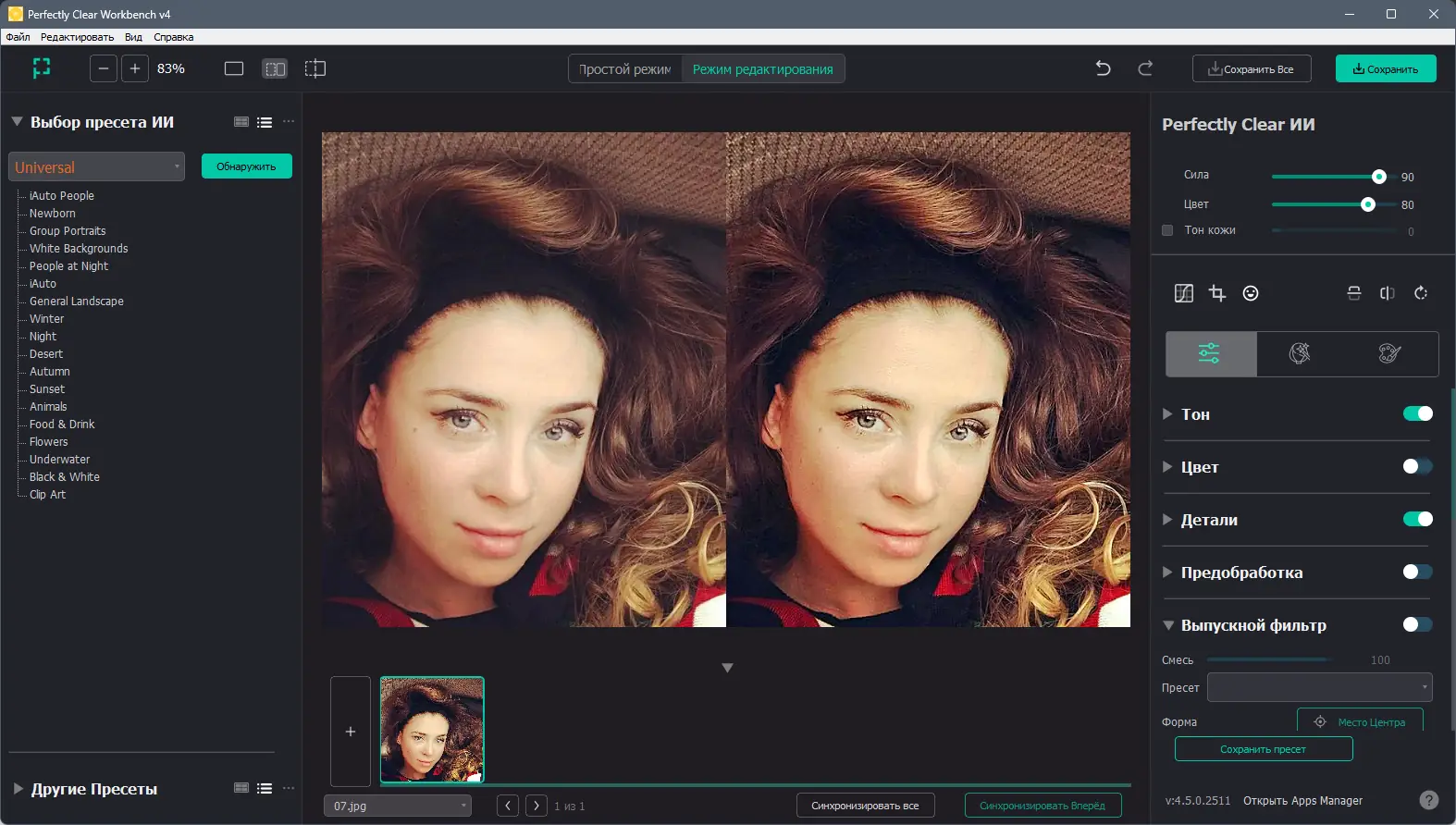 Perfectly Clear использует фирменный движок, который анализирует изображение и подбирает параметры коррекции с учётом контекста сцены, что делает обработку максимально точной.