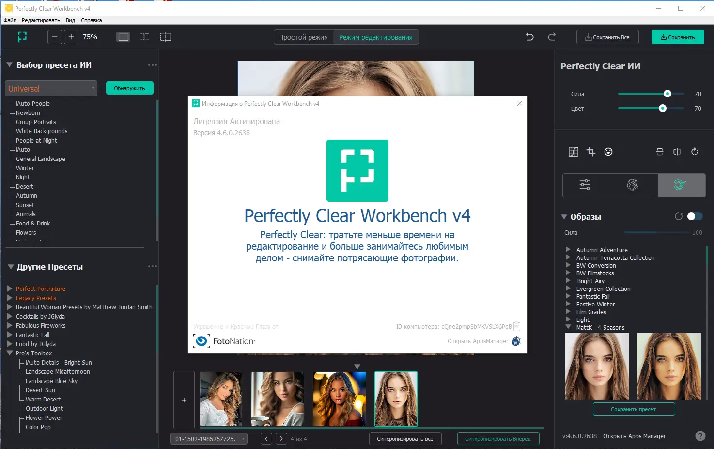 Perfectly Clear WorkBench — мощный инструмент для автоматической и ручной коррекции изображений, сочетающий передовые технологии обработки с простым интерфейсом. Программа устраняет дефекты фото, такие как шумы, засветки, размытость и эффект «красных глаз», применяя запатентованные алгоритмы. Подходит как для новичков, так и для профессиональных фотографов, стремящихся быстро получать качественные снимки.