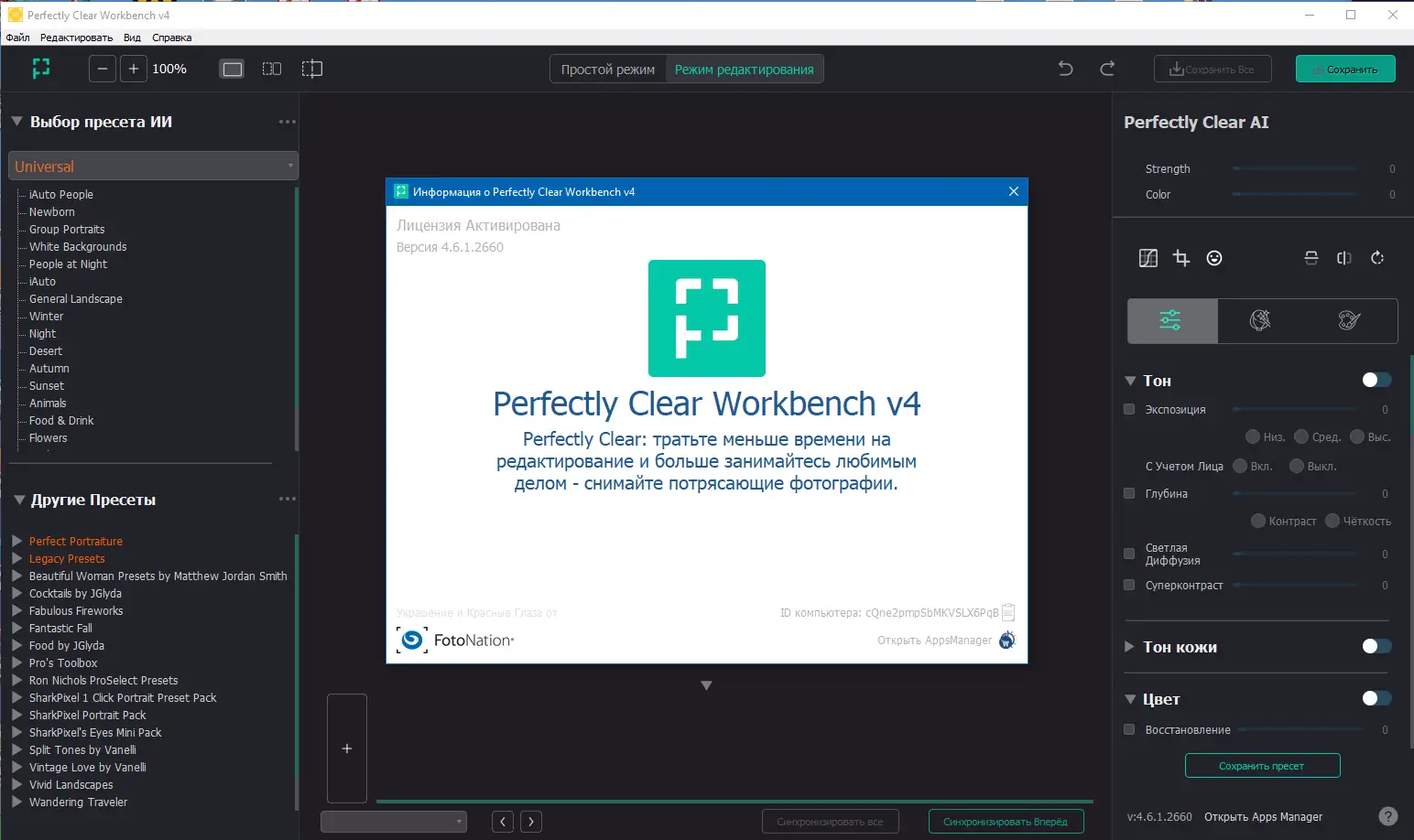 Perfectly Clear WorkBench — это мощный инструмент для автоматической и ручной коррекции изображений, разработанный для устранения типичных дефектов фотографий с использованием запатентованных технологий обработки. Программа сочетает в себе высокую точность настроек и простоту интерфейса, позволяя мгновенно улучшать качество снимков без необходимости глубоких знаний в области ретуши. Это универсальное решение как для любителей, так и для профессионалов, стремящихся к идеальному результату без лишних усилий.