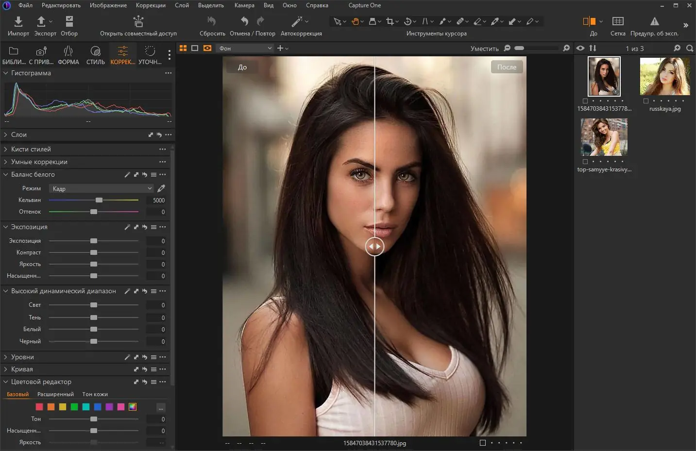 Phase One Capture One — профессиональный редактор и конвертер RAW-фотографий, обеспечивающий высокоточную обработку изображений с поддержкой камер ведущих производителей и точной цветопередачей. Программа ориентирована на фотографов, которым необходим полный контроль над цветом, экспозицией и детализацией. Она сочетает в себе мощные инструменты коррекции и удобный интерфейс, позволяя обрабатывать снимки на уровне студийного качества.