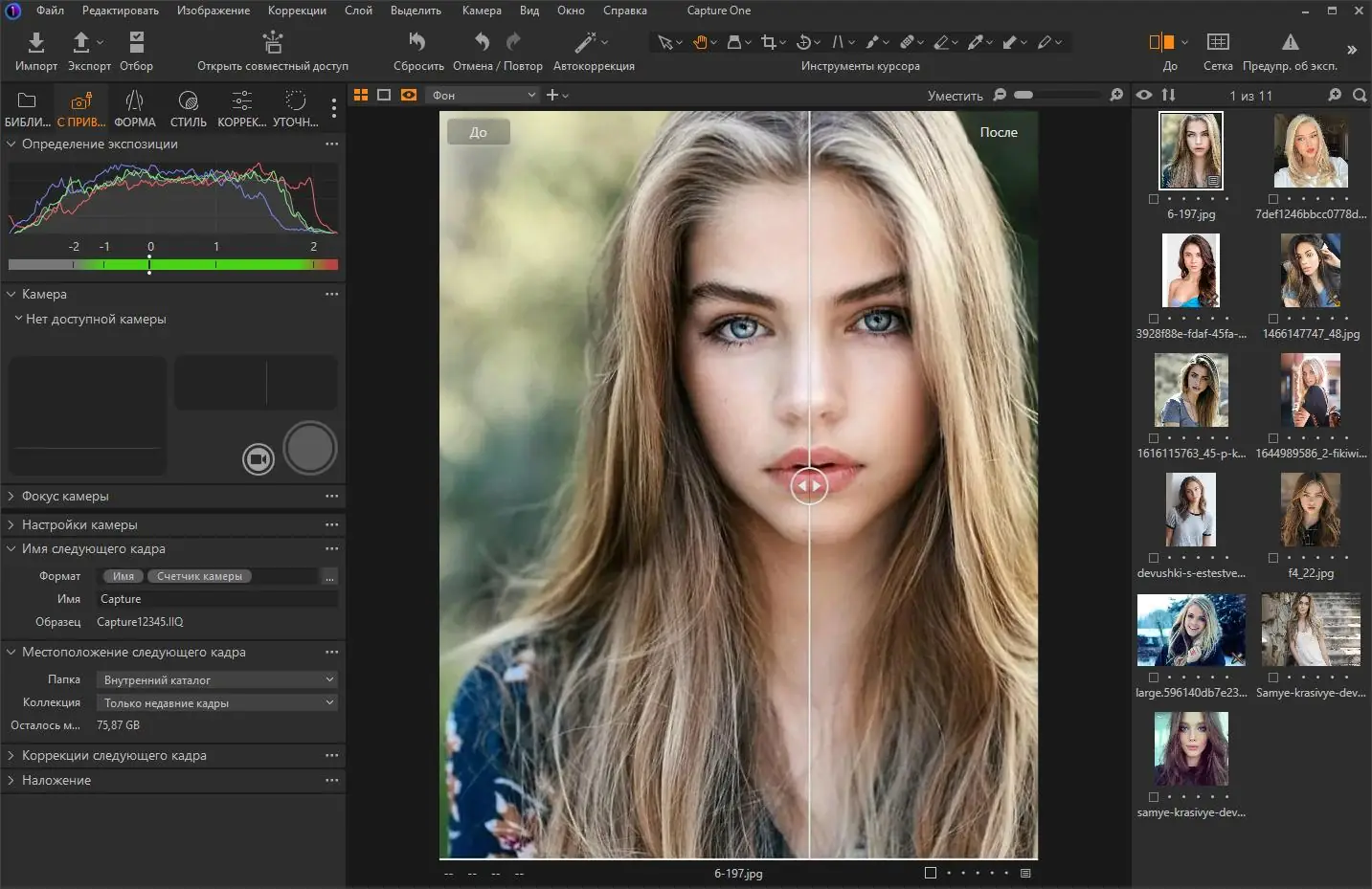 Интерфейс программы организован по принципу модульности, что позволяет быстро переключаться между импортом, редактированием, цветокоррекцией и экспортами. После подключения камеры можно осуществлять прямой захват снимков по кабелю или через Wi-Fi, что удобно при студийной съёмке. Рабочая область настраивается под нужды пользователя, поддерживается работа на двух мониторах: один отображает исходное изображение, второй — панели инструментов. Импорт файлов сопровождается предпросмотром, а пакетная обработка позволяет применять заданные пресеты к группе фотографий, экономя время. Для цветокоррекции используется интуитивный цветовой круг и пипетка для выбора нейтральной точки, а отдельная панель предназначена для корректировки оттенков кожи с возможностью сохранения собственных профилей.