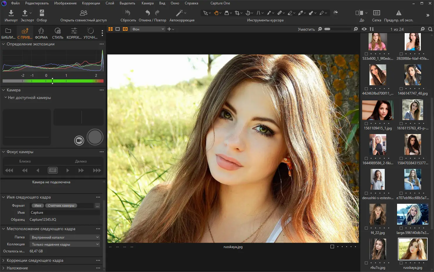 После запуска приложения пользователь может импортировать снимки с предварительным просмотром, настроить пакетную обработку по заданным параметрам и выполнить одновременную конвертацию одного RAW-файла в несколько форматов. Работа с цветом осуществляется через цветовой круг и отдельную панель для настройки оттенков кожи, с возможностью сохранения пресетов. Прямой захват изображений с камеры возможен через USB-кабель или по Wi-Fi, что удобно при студийной съёмке. Функция оверлея помогает выстраивать композицию, а поддержка нескольких мониторов расширяет рабочее пространство.