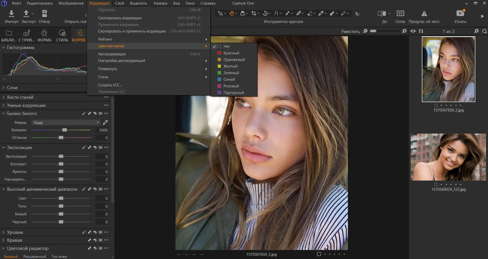 - Инструменты для тонкой цветокоррекции, включая круг настройки оттенков и пипетку баланса белого