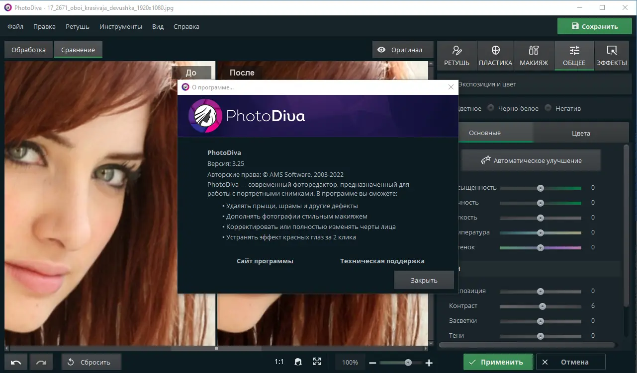 PhotoDiva — это мощный фоторедактор для автоматической и ручной ретуши портретов, созданный для быстрого улучшения внешнего вида людей на фотографиях. Программа подходит как новичкам, так и опытным пользователям, позволяя за несколько кликов устранять дефекты кожи, менять черты лица, наносить виртуальный макияж и заменять фон. Благодаря интуитивному интерфейсу и продуманному функционалу, PhotoDiva упрощает процесс обработки снимков без необходимости изучать сложные инструменты.