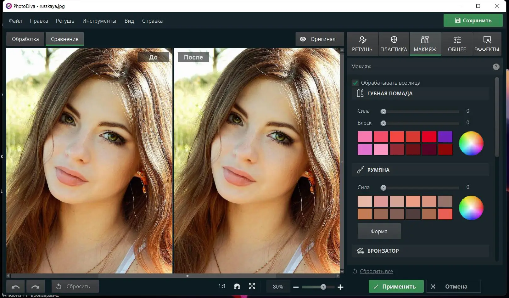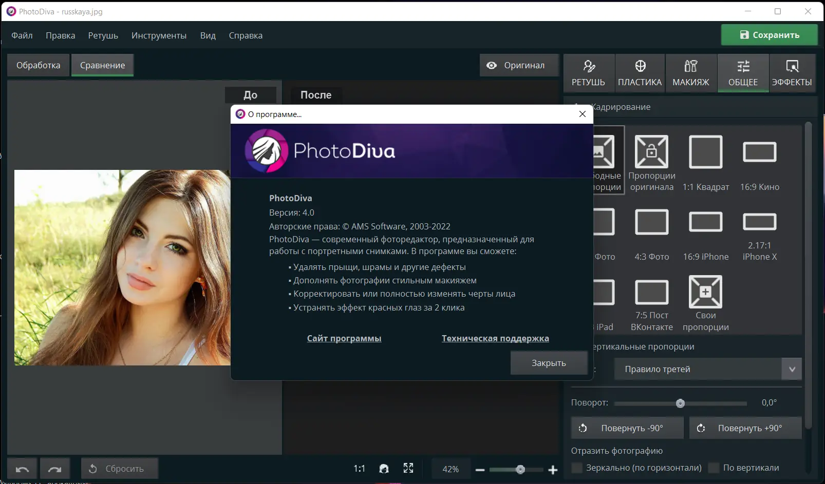 PhotoDiva — это современный фоторедактор, ориентированный на быструю и качественную ретушь портретов. Программа подходит как для новичков, так и для пользователей, желающих оперативно улучшить внешний вид фотографий. С её помощью можно устранить дефекты кожи, скорректировать черты лица, изменить макияж и фон, а также применить автоматические пресеты для мгновенного эффекта.