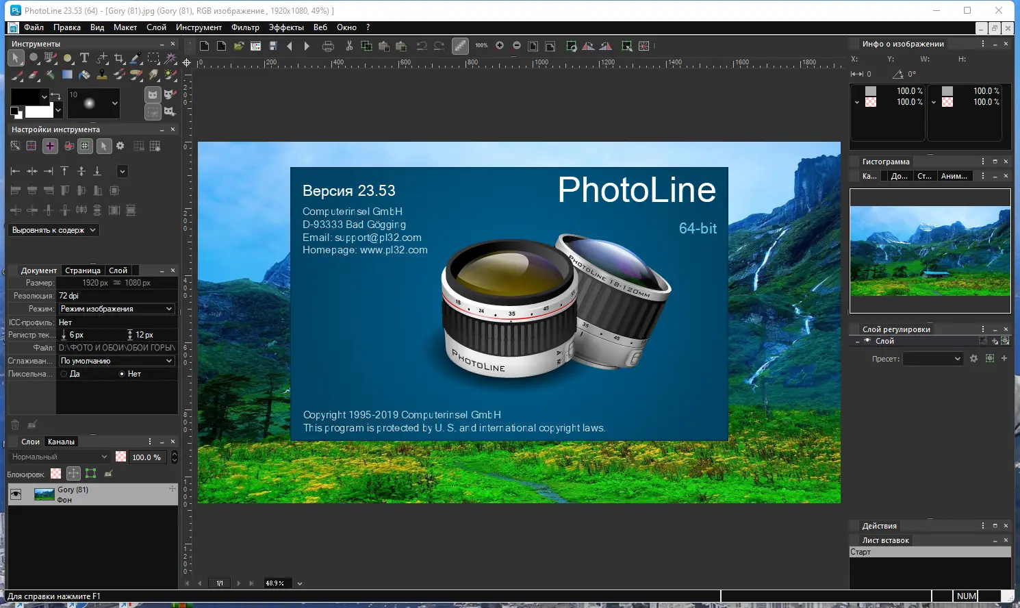 PhotoLine — это универсальный редактор растровой и векторной графики, сочетающий в себе мощные инструменты обработки изображений, поддержку множества форматов и продвинутые функции для работы с цветом. Программа подходит как для художников, так и для верстальщиков, дизайнеров и фотографов, обеспечивая высокую точность и гибкость при создании и редактировании графического контента. Она поддерживает 16-битные каналы, цветовые модели CMYK и Lab, а также позволяет работать с ICC-профилями для точного управления цветопередачей.