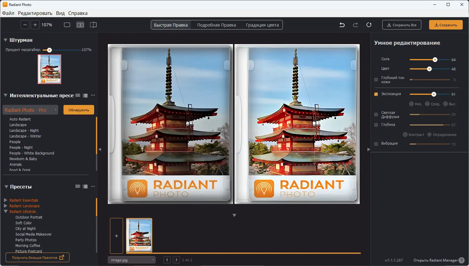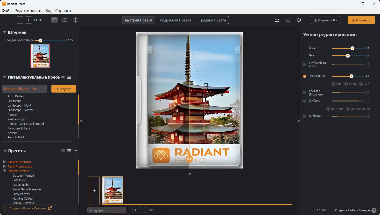 Radiant Photo — это мощный инструмент для обработки изображений, сочетающий в себе продвинутые функции цветокоррекции, стилизации и управления фотографиями. Программа подходит как для начинающих, так и для опытных пользователей, стремящихся улучшить качество своих снимков. Она поддерживает широкий спектр форматов, включая RAW, и предлагает неразрушающее редактирование, сохраняя оригинальные файлы в безопасности.