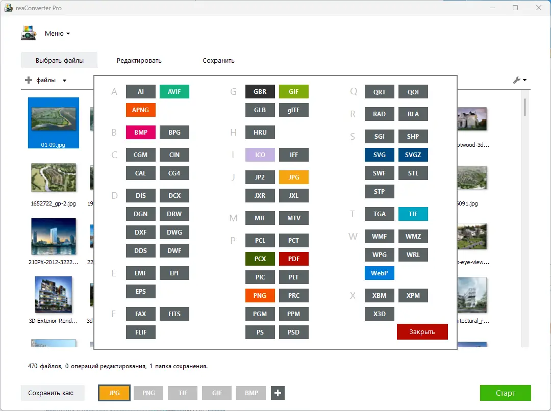 - Поддержка конвертации в форматы JPEG, PNG, TIFF, PDF, RAW, SVG, а также документов Microsoft Office и чертежей САПР