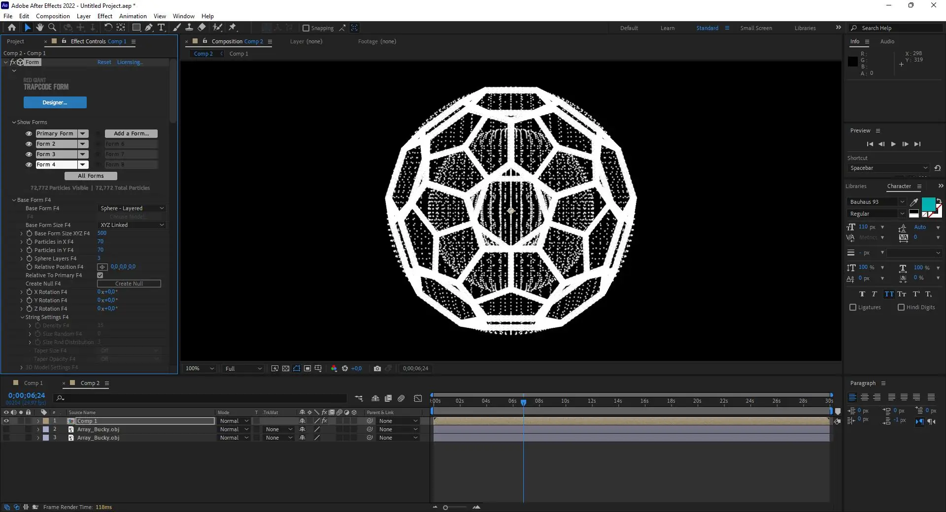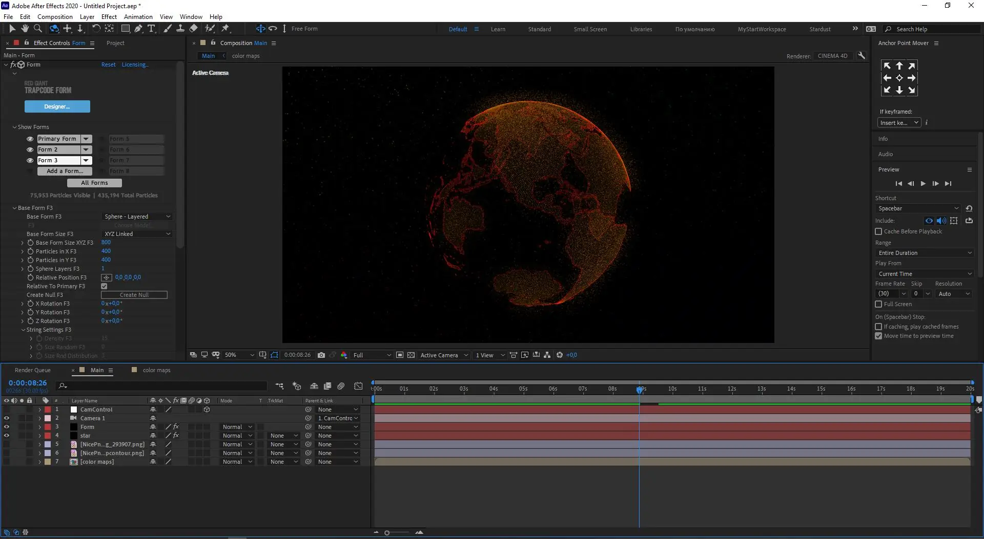 - Trapcode Form создаёт 3D-сетки и анимированные поверхности на основе текстурированных точек, что позволяет формировать органические и технологичные формы.