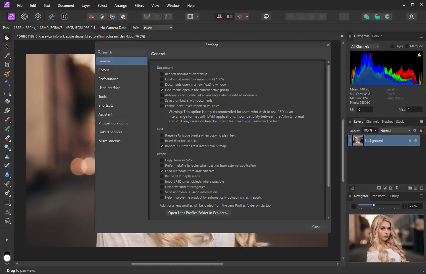 Работа с программой начинается с выбора подходящей «Персоны» — режима, настроенного под определённый этап редактирования. В режиме Develop осуществляется первичная обработка RAW-снимков с настройкой баланса белого, экспозиции и шумоподавления. Персона Photo предоставляет доступ к инструментам для точечной коррекции, работы со слоями, масками и векторными объектами. В режиме Liquify можно выполнять пластические изменения, корректируя черты лица или форму объектов с помощью интуитивных деформаций. Экспорт проектов настраивается в одноимённой персоне, где можно задать области вывода, форматы и параметры сжатия. Интерфейс поддерживает кастомизацию панелей и сочетаний клавиш, аналогичных Adobe, что упрощает переход для пользователей других редакторов. Поддержка плагинов Photoshop в версии 3.3322 расширяет функциональность за счёт сторонних расширений.