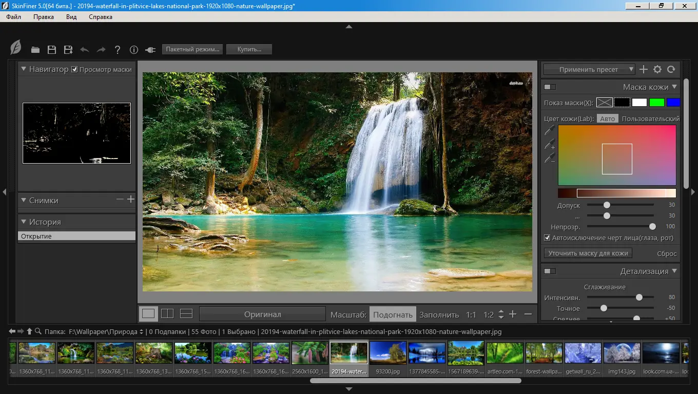 Работа с программой начинается с загрузки изображения, после чего Skin Finer автоматически применяет базовую маску выделения кожи. Пользователь может отрегулировать чувствительность маски, чтобы более точно охватить или исключить определённые участки. Далее доступны инструменты коррекции: с помощью ползунков регулируется степень сглаживания, насыщенность, баланс светов и теней, а также цветовой тон кожи. После завершения настроек результат можно экспортировать в любом поддерживаемом формате с сохранением 16-битной глубины цвета.