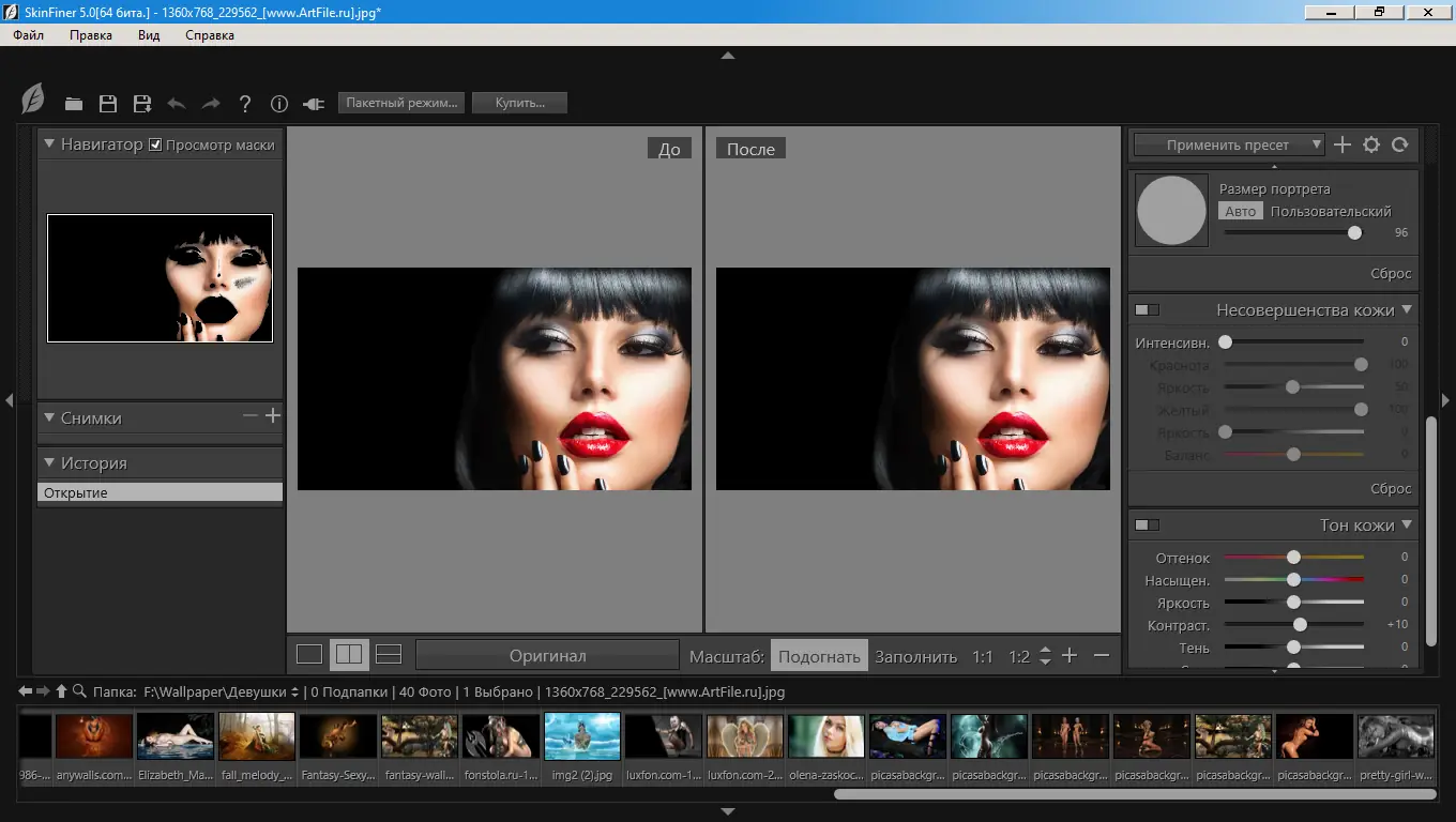 - Автоматическое сглаживание текстуры кожи с сохранением естественной структуры
