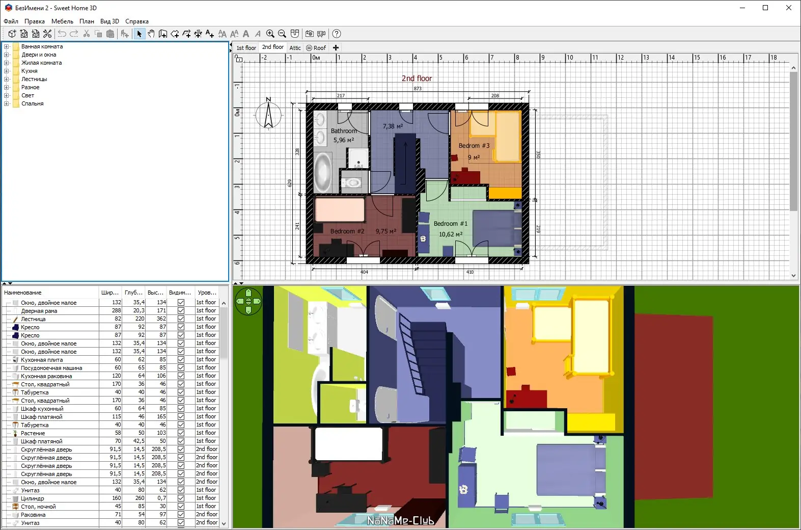 Sweet Home 3D представляет собой комплексное решение для проектирования жилых и коммерческих помещений с возможностью детальной проработки интерьера. Пользователи могут строить стены, задавать их параметры — толщину, текстуру, цвет — и наполнять пространство мебелью, техникой и декоративными элементами из встроенной библиотеки. Интерфейс разделён на несколько зон: план в 2D, трёхмерная модель, панель объектов и список использованных элементов, что обеспечивает удобную навигацию и контроль над проектом.