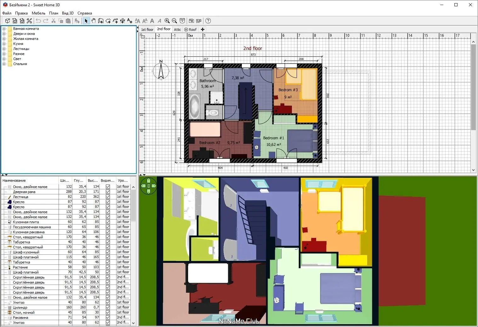 - Разделённый интерфейс с четырьмя зонами: план, список объектов, библиотека, 3D-просмотр