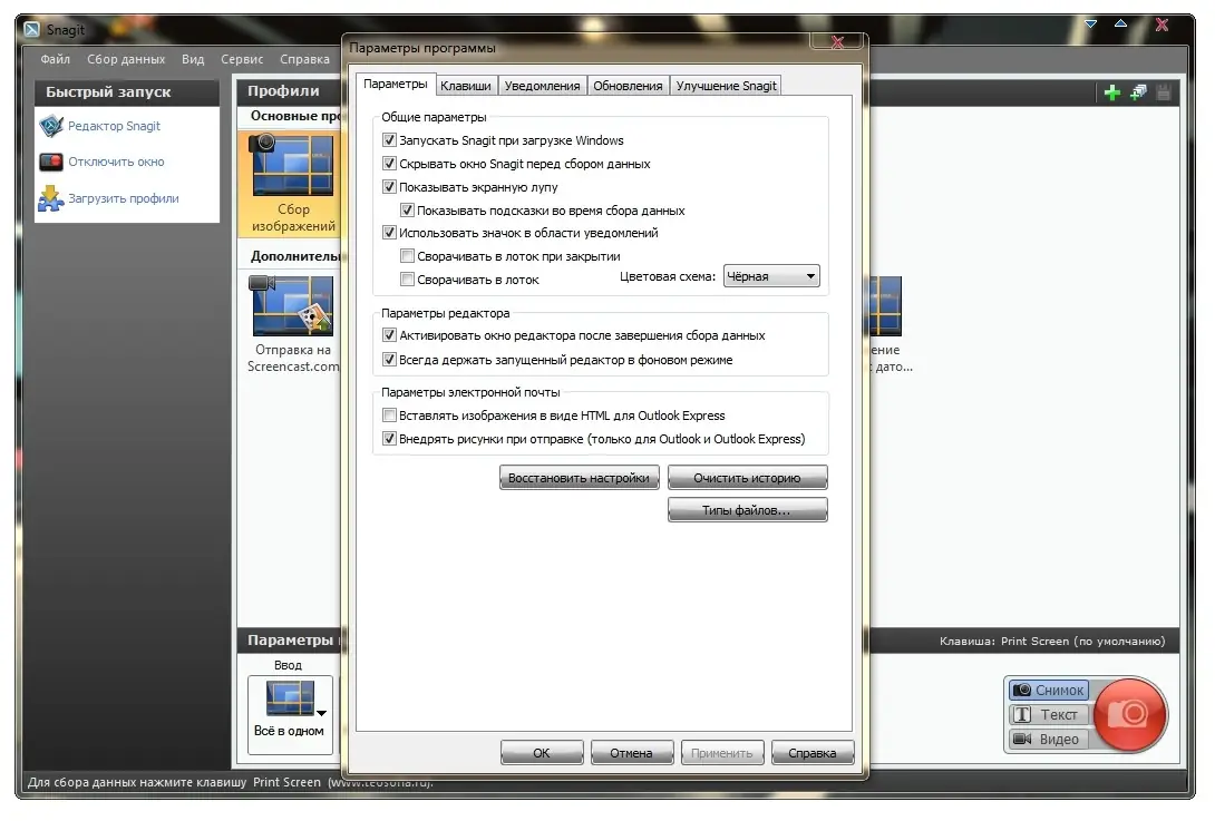 Работа с программой начинается с выбора режима захвата через обновлённое окно «Capture Window», заменившее старую панель OneClick. Пользователь может выбрать тип захвата — изображение, видео или область экрана — и сразу корректировать выделение до финального снимка. После захвата изображение автоматически открывается в редакторе, где доступны инструменты для аннотаций, обрезки, поворота и добавления эффектов. Новые профили позволяют сохранить настройки для последующего использования, а тегирование отдельных снимков упрощает их поиск и организацию. Видео можно обрезать прямо в программе, вырезая ненужные фрагменты без использования стороннего ПО.
