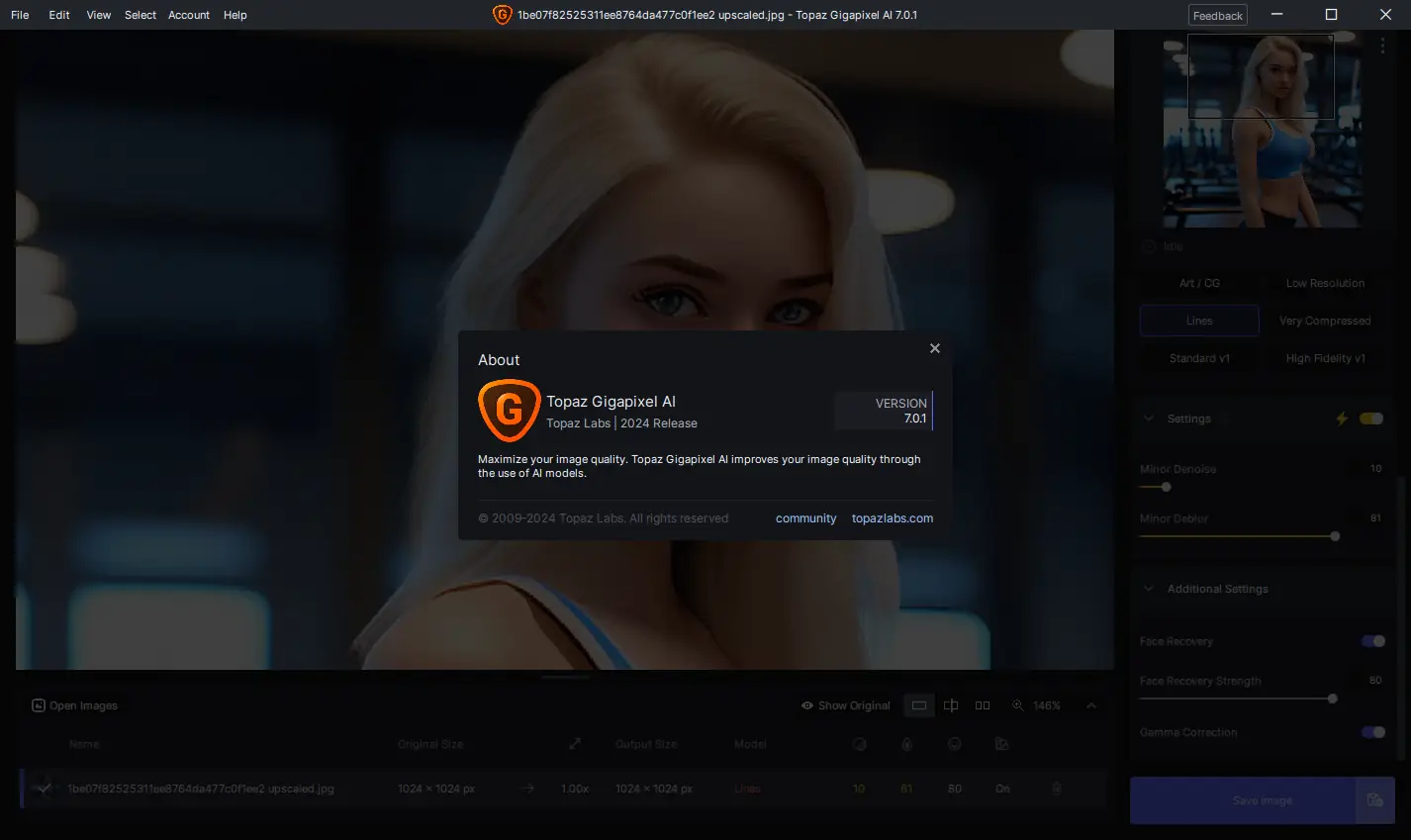 Topaz Gigapixel AI — инновационный редактор изображений, использующий технологии искусственного интеллекта для увеличения разрешения фотографий с сохранением естественных деталей и текстур. Программа эффективно устраняет артефакты, повышает чёткость и подходит для обработки портретов, пейзажей, архитектуры и других типов изображений. Благодаря глубокому обучению, алгоритмы точно воссоздают недостающие пиксели, обеспечивая фотореалистичный результат.