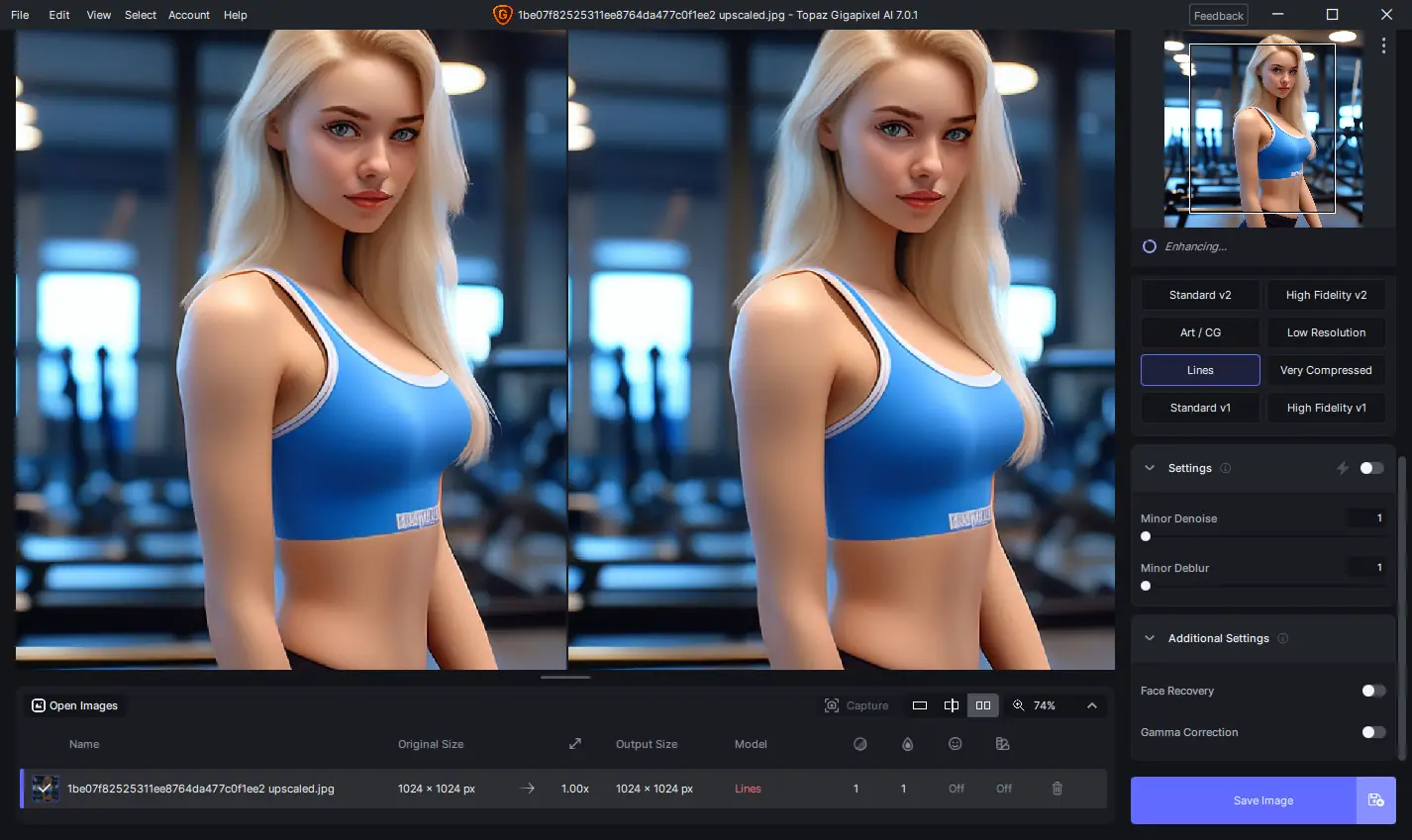 Использование Topaz Gigapixel AI интуитивно понятно даже для новичков. После загрузки изображения пользователь выбирает желаемый коэффициент масштабирования и активирует одну из предустановленных моделей — например, для портретов, архитектуры или сжатых файлов. Программа автоматически обрабатывает картинку, применяя соответствующие алгоритмы ИИ. По завершении можно сравнить исходное и увеличенное изображение, после чего сохранить результат в нужном формате. Поддерживаются популярные форматы, включая JPEG, PNG, TIFF и RAW.