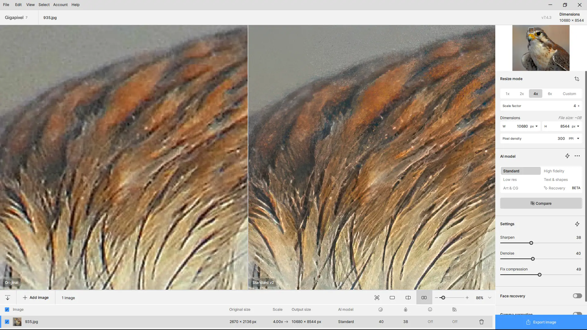 Интерфейс программы интуитивно понятен и не требует глубоких технических знаний. После загрузки изображения пользователь выбирает нужный режим обработки — например, для портретов, архитектуры или сжатых файлов. Далее задаётся коэффициент увеличения, который может достигать 600%. Программа автоматически применяет соответствующую модель ИИ, обрабатывает изображение и выводит результат в реальном времени для сравнения. Поддерживаются форматы JPEG, PNG, TIFF и другие. Готовый файл можно сохранить с высоким DPI для печати или дальнейшего редактирования в графических редакторах.
