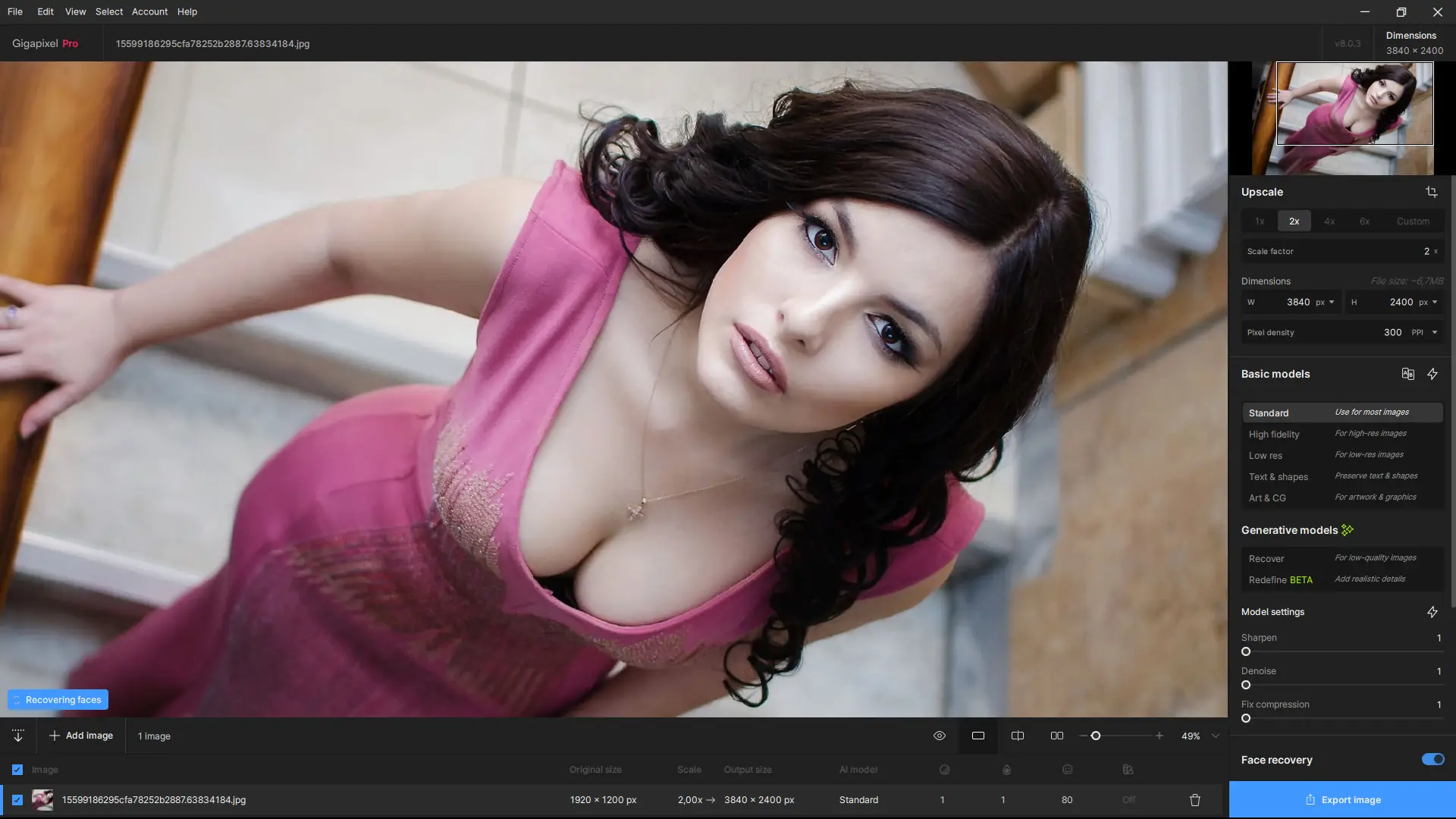 Интерфейс программы интуитивно понятен и ориентирован на быструю обработку. Пользователь загружает изображение, выбирает необходимый коэффициент масштабирования — до 600% — и активирует одну из предустановленных моделей обработки, например, для портретов, архитектуры или сжатых файлов. Программа автоматически применяет подходящие настройки, но позволяет вручную корректировать параметры, такие как сила шумоподавления, резкость и тип восстановления. После предварительного просмотра результат можно экспортировать в популярных форматах, включая TIFF, PNG и JPEG, с сохранением исходного цветового профиля.
