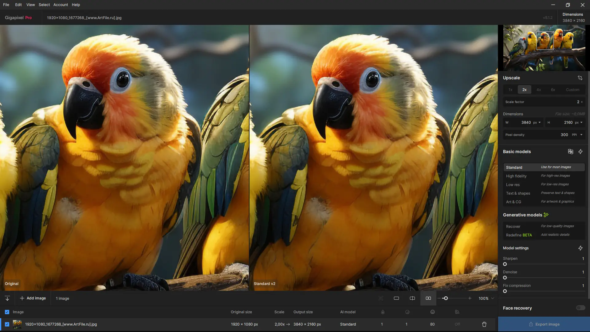 Интерфейс программы интуитивно понятен и не требует глубоких знаний в области обработки изображений. Достаточно загрузить снимок, выбрать нужный коэффициент увеличения и активировать одну из предустановленных моделей — например, для портретов, архитектуры или сжатых изображений. После обработки можно сравнить исходник и результат в режиме до/после, оценить детализацию на микроуровне. Поддерживаются форматы JPEG, PNG, TIFF и другие, включая RAW-файлы. Обработка происходит локально, что обеспечивает конфиденциальность данных.
