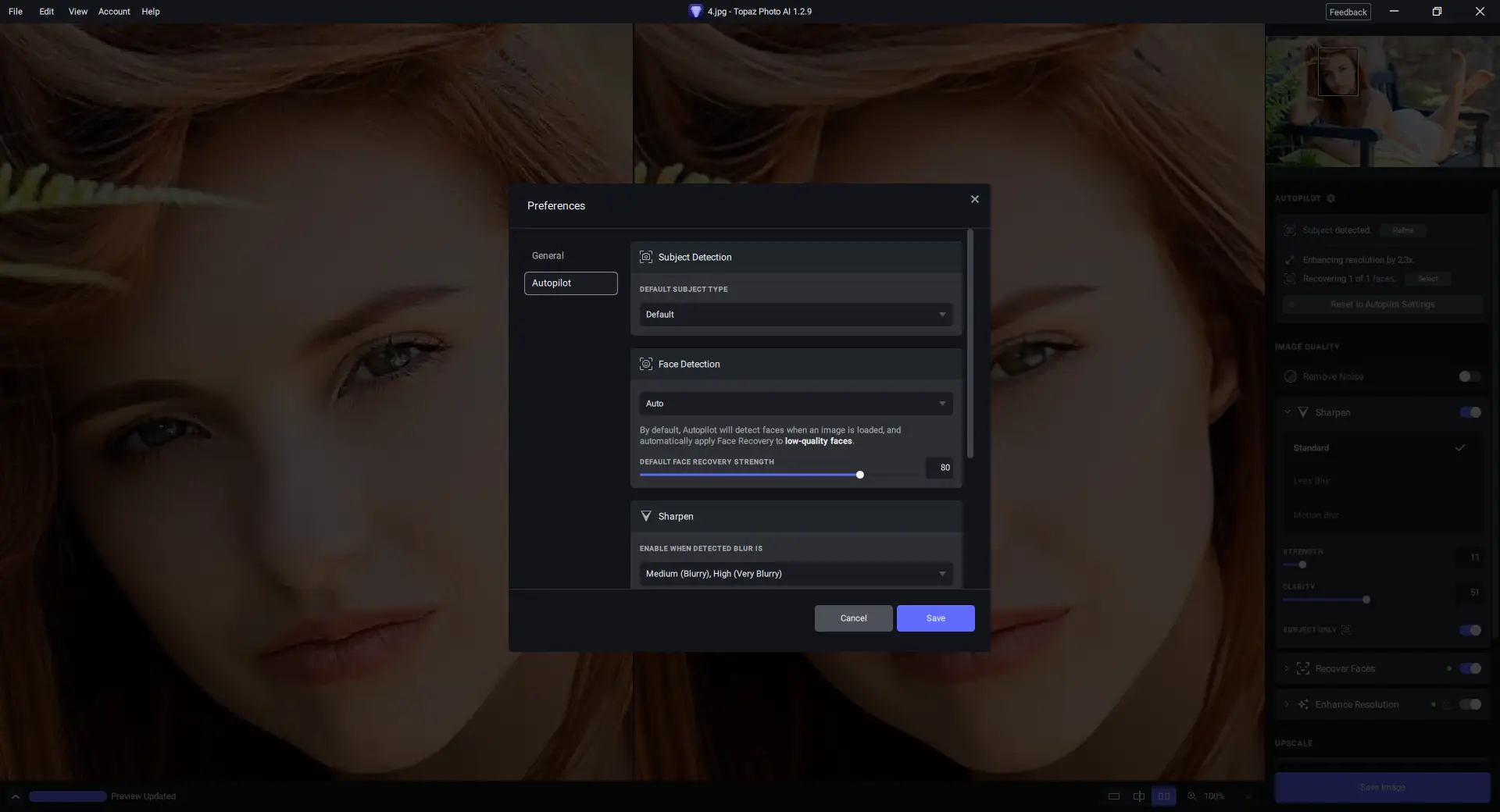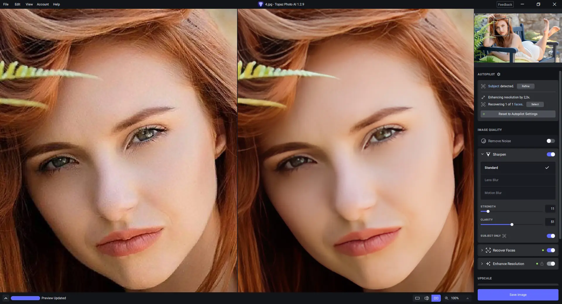 Работа с программой начинается с загрузки изображения через интерфейс или перетаскивания файла в рабочую область. Система сразу запускает анализ с помощью Autopilot, определяя наличие шума, размытости или необходимости увеличения. Пользователь может принять автоматические настройки или вручную скорректировать параметры, такие как сила шумоподавления, уровень резкости и масштаб увеличения. После предварительного просмотра результатов выполняется экспорт изображения в нужном формате.