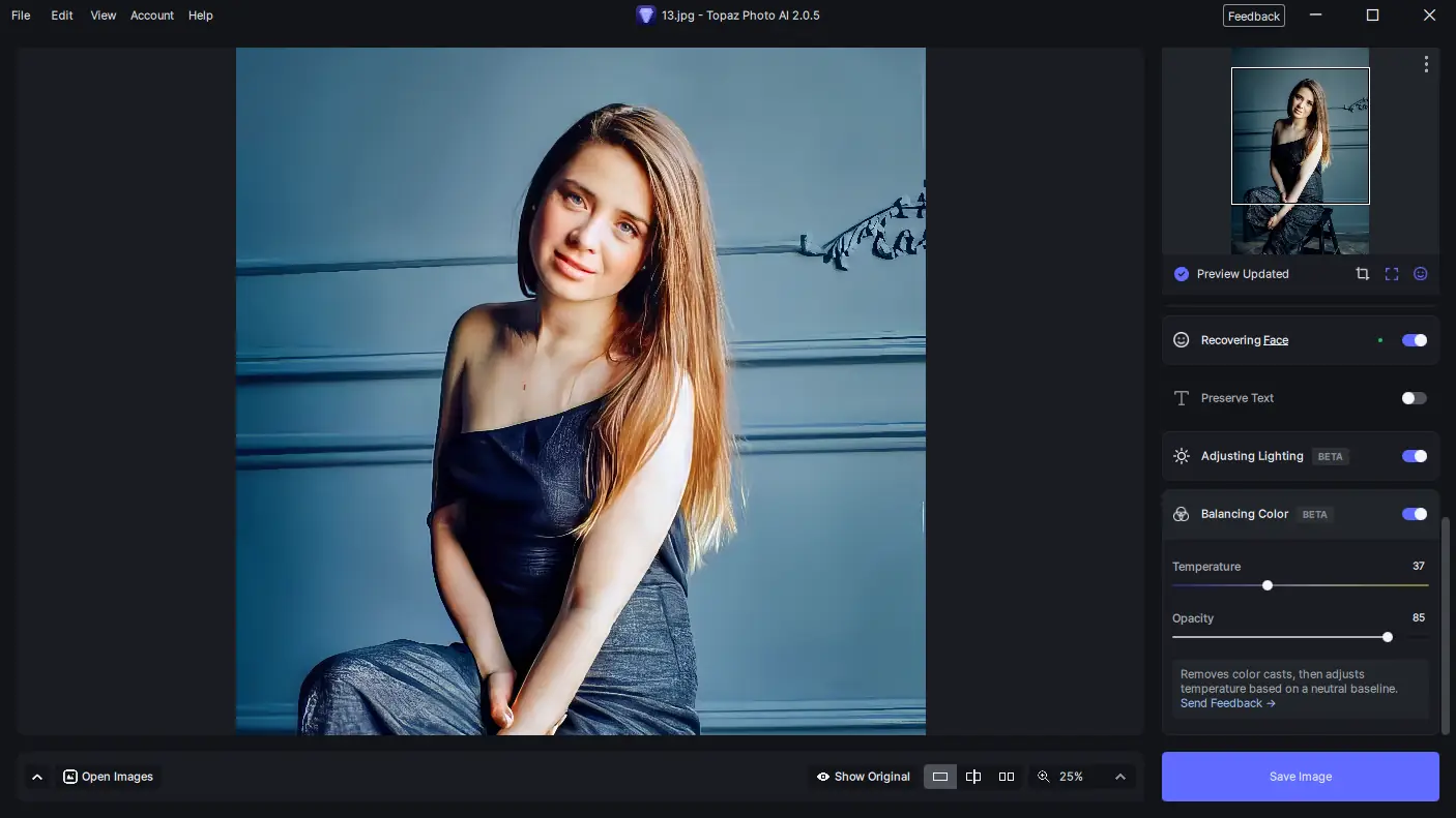 Использование Topaz Photo AI не требует глубоких знаний в области обработки изображений. Достаточно загрузить фотографию в интерфейс программы, после чего она автоматически проанализирует снимок и предложит оптимальные настройки. Пользователь может принять автоматические рекомендации или вручную регулировать интенсивность шумоподавления, резкости и масштабирования. Для серии изображений доступна пакетная обработка, что особенно полезно при работе с большими фотосессиями.