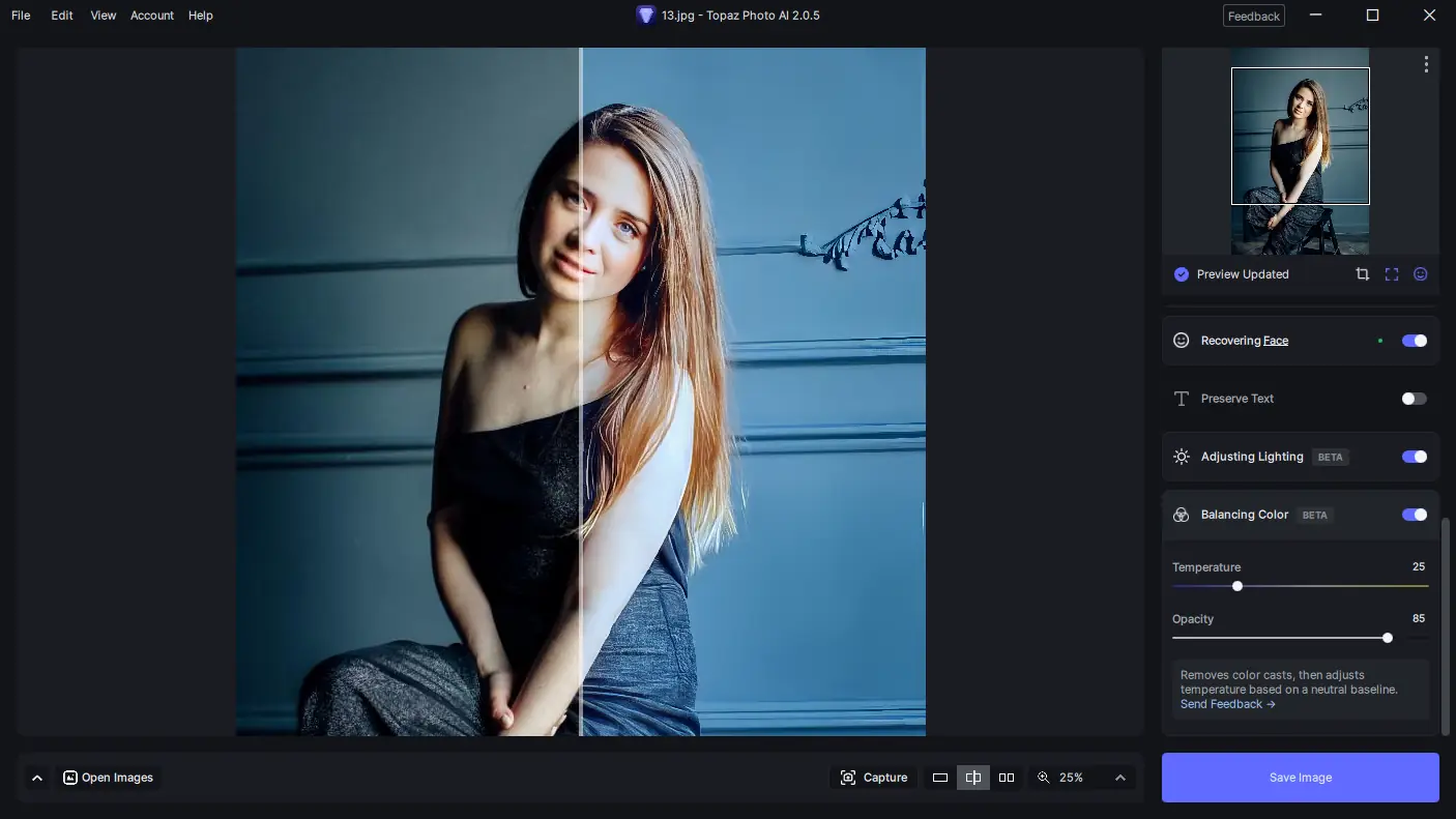 Topaz Photo AI представляет собой интегрированное решение для автоматической обработки цифровых изображений с использованием продвинутых алгоритмов машинного обучения. Программа эффективно справляется с типичными проблемами фотографий — шумами, размытием и низким разрешением, сохраняя при этом детали и естественность картинки. Благодаря объединению возможностей Denoise AI, Sharpen AI и Gigapixel AI, приложение упрощает рабочий процесс, позволяя обрабатывать снимки в едином интерфейсе.