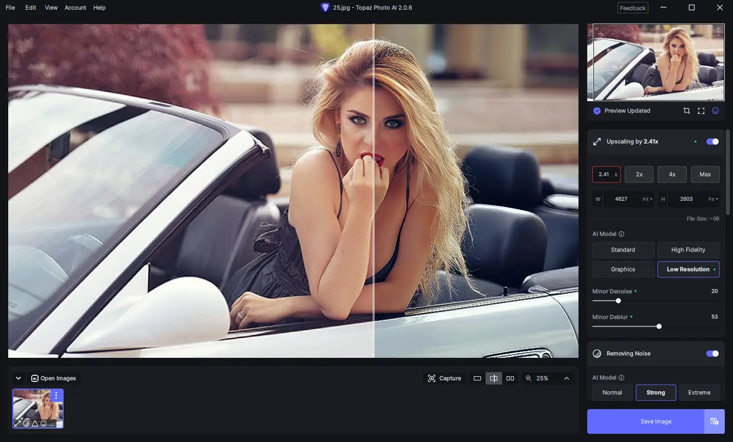 Использование Topaz Photo AI не требует глубоких знаний в области обработки изображений. После запуска приложения достаточно загрузить фотографию, после чего система автоматически проанализирует её и предложит оптимальные настройки. Пользователь может выбрать режим автоматической коррекции или перейти в ручной режим для более точной настройки параметров шума, резкости и масштабирования. Интерфейс интуитивно понятен, а предпросмотр изменений в реальном времени помогает оценить результат до финального экспорта.