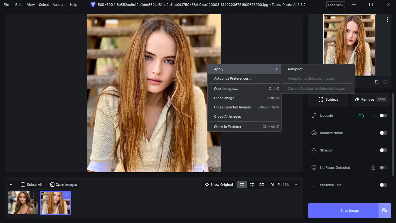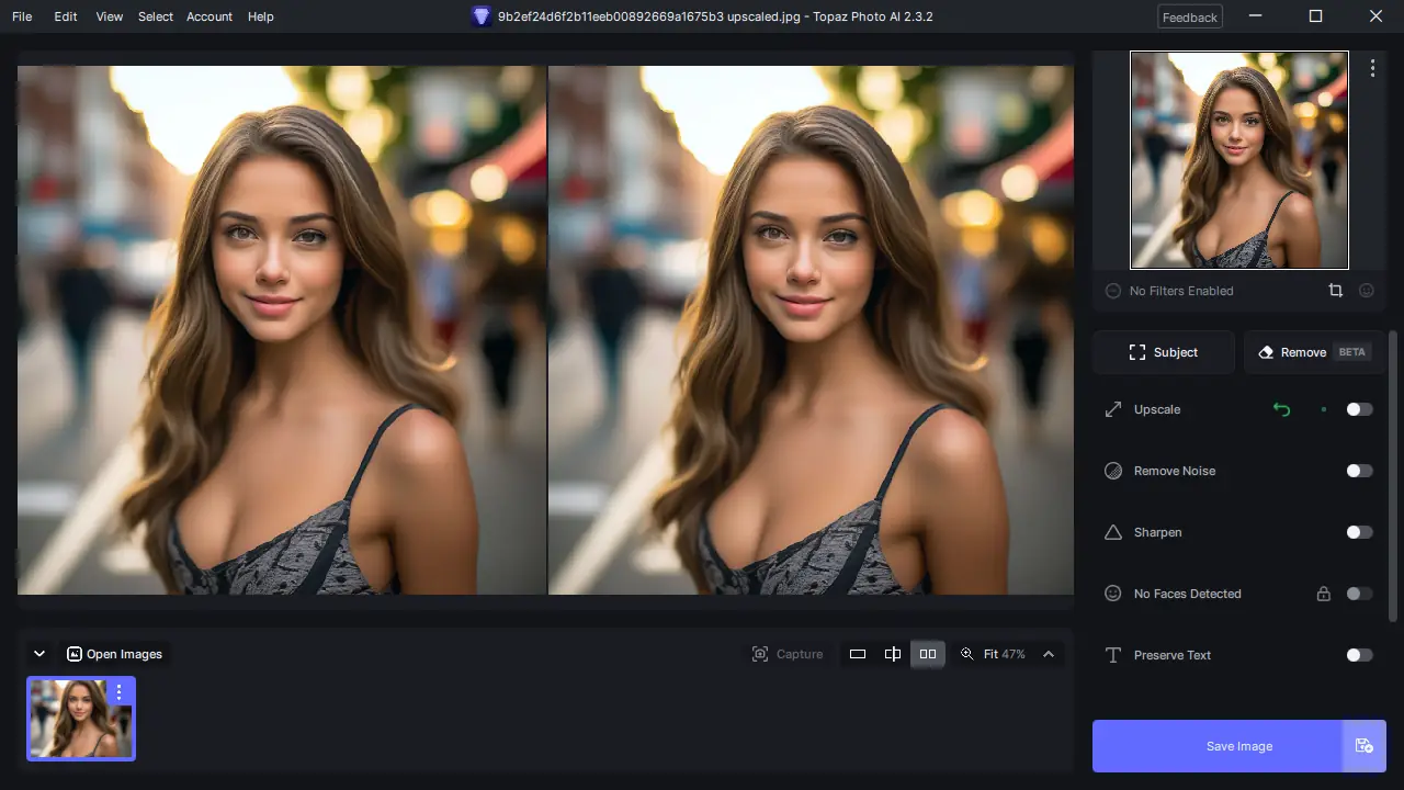 Работа с программой начинается с загрузки изображения через интерфейс. После этого активируется анализ снимка, в ходе которого система определяет наличие шума, размытости или необходимости увеличения. Пользователь может выбрать автоматический режим или перейти к ручной настройке параметров, таких как уровень шумоподавления, интенсивность резкости и масштаб. Готовый результат можно предварительно просмотреть и экспортировать в популярные графические форматы, включая TIFF, JPEG и PNG.