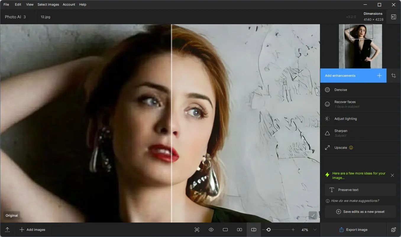 Работа с программой начинается с загрузки изображения в интерфейс. Система автоматически запускает анализ, выявляя шум, размытость или недостаточное разрешение. Пользователь может принять предложенные настройки или вручную скорректировать интенсивность обработки для каждого параметра — шумоподавления, резкости и масштабирования. После настройки применяется обработка, и результат можно сравнить с оригиналом в режиме до/после. Готовое изображение экспортируется в выбранный формат с сохранением исходного качества.