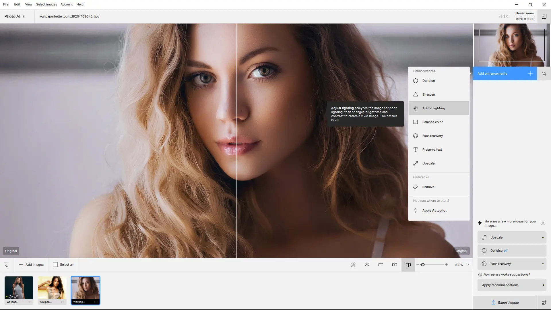 Использование программы начинается с загрузки изображения через интерфейс или перетаскивания файла в рабочую область. После анализа изображения система предлагает автоматические коррекции, которые можно принять или изменить вручную. Пользователь может регулировать интенсивность шумоподавления, уровень резкости и масштаб увеличения, наблюдая за изменениями в режиме реального времени.