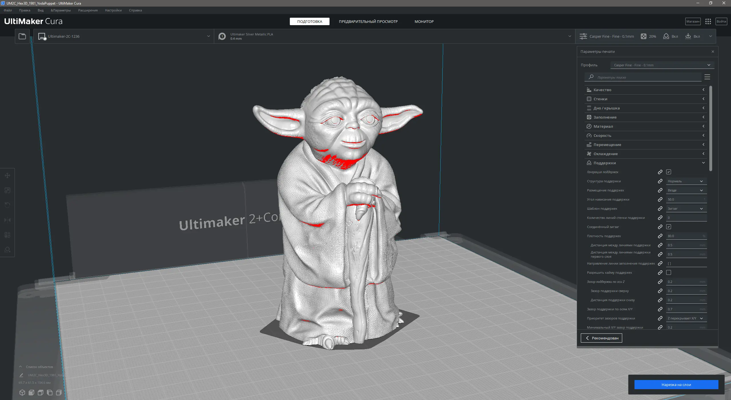 Работа с программой начинается с добавления 3D-модели в рабочую область, после чего система автоматически предлагает оптимальные параметры печати. Пользователь может выбрать режим — рекомендуемый или расширенный, в зависимости от уровня подготовки. Все основные настройки доступны через боковую панель, включая толщину слоя, тип заполнения, наличие поддерживающих структур и обводки. После настройки модель можно экспортировать на SD-карту или отправить на печать напрямую через сеть.
