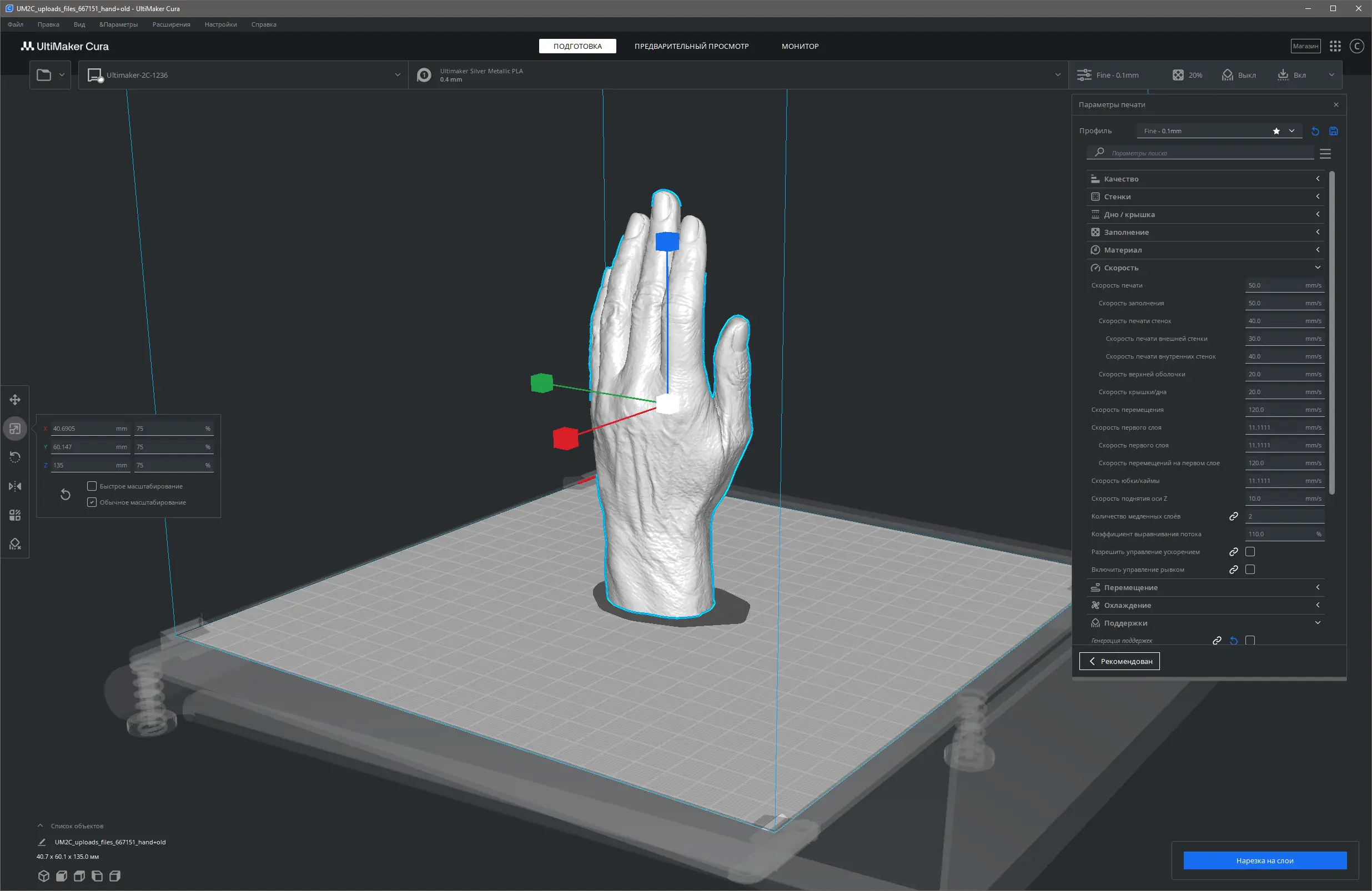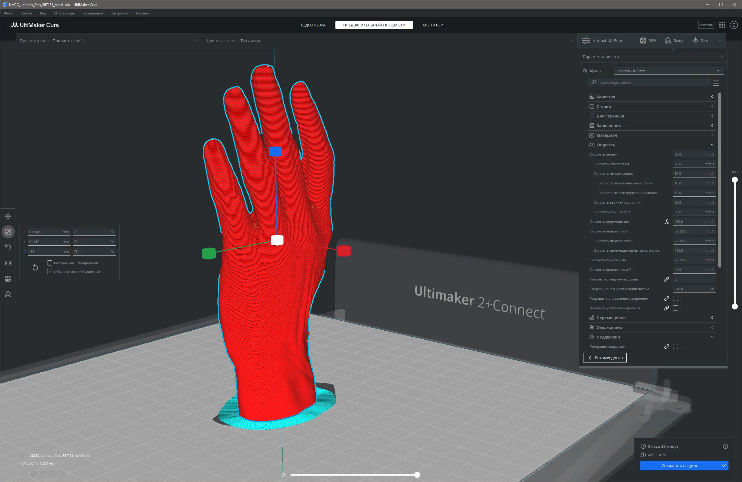 Работа с программой начинается с импорта 3D-модели в одном из поддерживаемых форматов, таких как STL, OBJ или 3MF. После загрузки модель автоматически позиционируется на платформе, после чего пользователь может масштабировать, поворачивать или корректировать её положение. Далее выбирается тип печати — из предустановленных профилей или вручную, с учётом типа пластика, скорости, температуры и других параметров. После настройки запускается процесс слайсинга, в результате которого формируется G-код, готовый к передаче на принтер через USB, SD-карту или по сети. Интерфейс позволяет предварительно просмотреть слои, оценить время печати и расход материала, что помогает избежать ошибок.