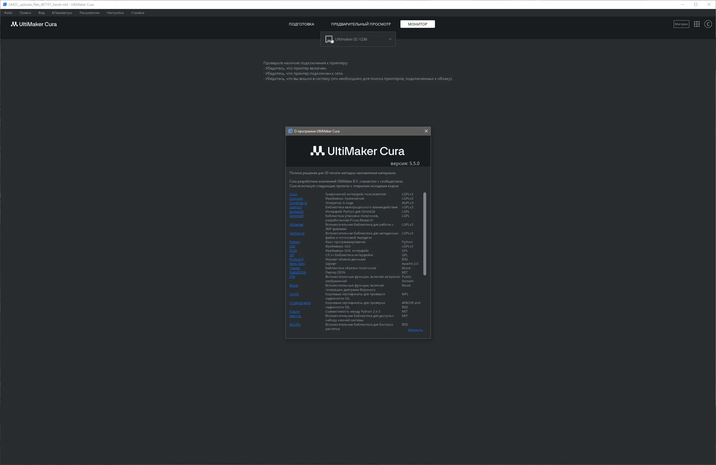 Ultimaker Cura — это программное обеспечение с открытым исходным кодом, предназначенное для подготовки 3D-моделей к печати. Оно активно используется как в домашних условиях, так и в небольших рабочих пространствах благодаря своей надёжности и простоте освоения. Программа поддерживает широкий спектр 3D-принтеров, включая модели сторонних производителей, и предлагает адаптированные параметры печати для каждого устройства. Архитектура приложения позволяет эффективно обрабатывать модели, корректно разбивать их на слои и подготавливать G-код для последующей печати.