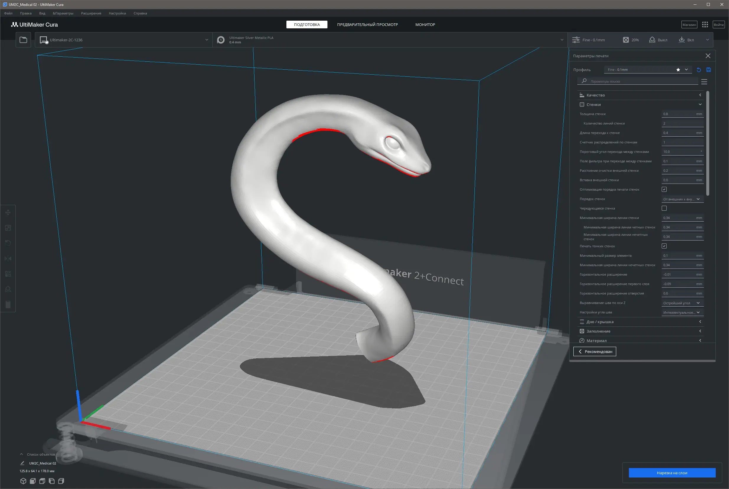 Запуск работы с программой начинается с добавления 3D-модели в рабочую область. Далее пользователь выбирает профиль печати, соответствующий его оборудованию, или использует рекомендуемые настройки для достижения наилучшего результата. Программа автоматически анализирует модель и предлагает оптимальные параметры, такие как толщина слоя, тип заполнения и необходимость использования поддержек. После предварительного просмотра слоёв можно отправить задание на принтер через USB, SD-карту или по сети.
