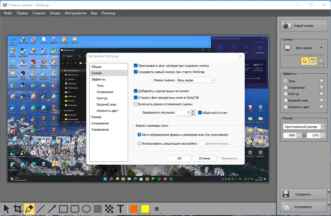 - Захват изображения с задержкой до нескольких секунд для подготовки окон