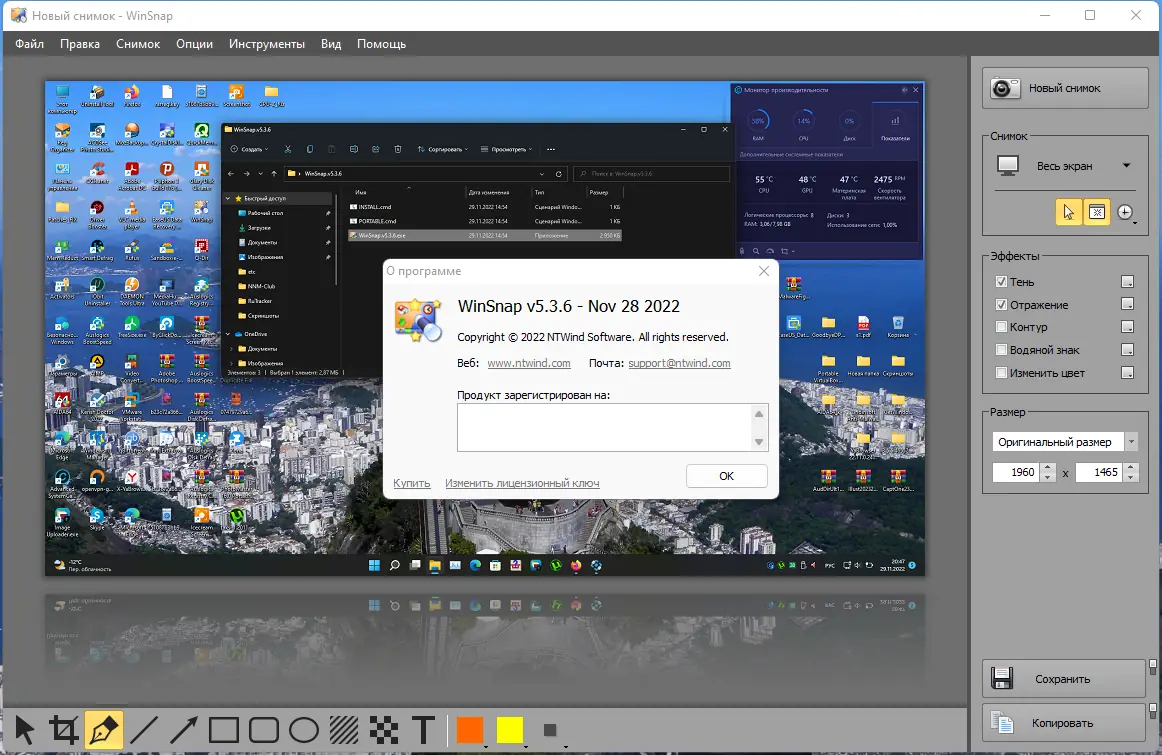 WinSnap — утилита, ориентированная на пользователей, которым регулярно требуется фиксировать содержимое экрана с возможностью дальнейшего редактирования. Программа поддерживает захват полного экрана, активного окна, отдельных элементов или выделенной пользователем области. Особое внимание уделено поддержке окон с нестандартной, например, закругленной или асимметричной формой, что особенно актуально при работе с современными интерфейсами.
