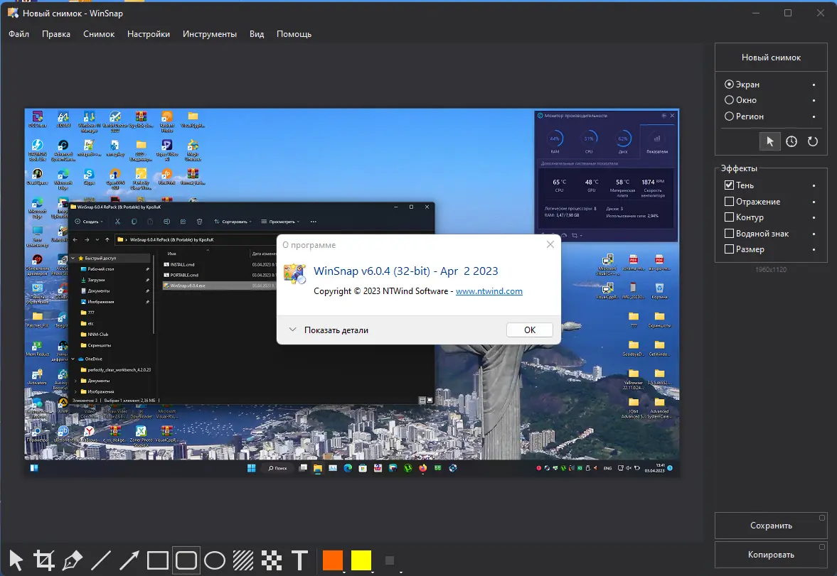 После запуска WinSnap работает в фоне, отображая иконку в системном трее. Для создания снимка можно воспользоваться горячими клавишами, настроить которые можно в параметрах программы. Доступны режимы захвата — весь экран, активное окно, прозрачный элемент или выделенная область. Перед съёмкой можно задать задержку, чтобы успеть открыть нужное меню или контекстное окно. После захвата изображение автоматически открывается в редакторе WinSnap, где можно применить эффекты, обрезать фрагмент или добавить подпись.