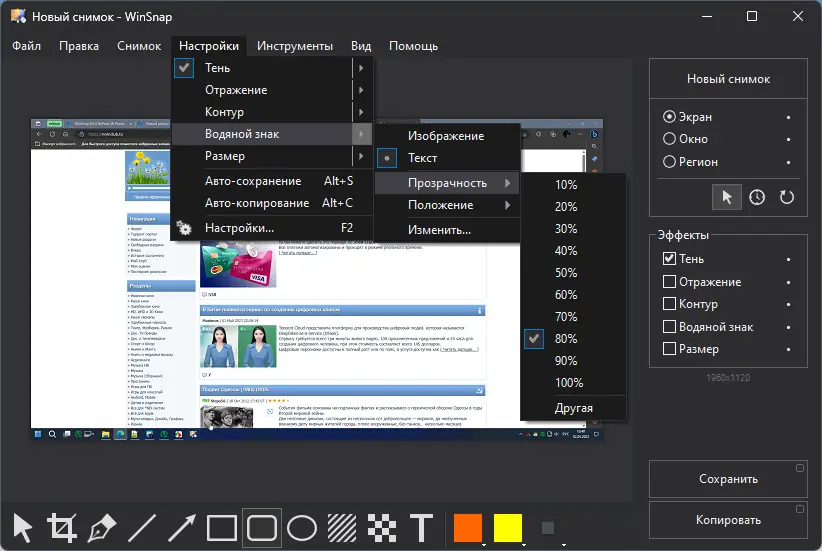 - Поддержка захвата экрана с эффектами теней и прозрачности
