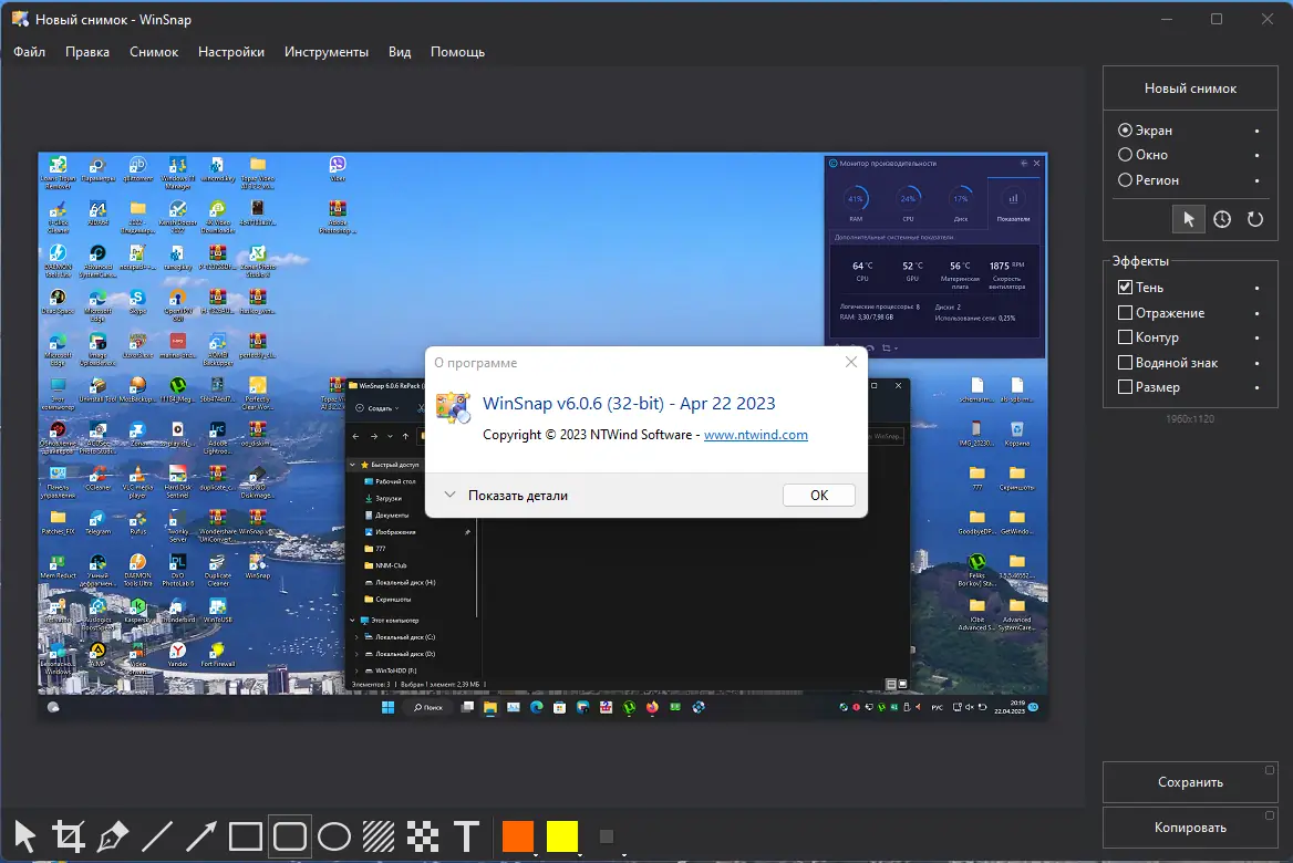 Использование программы начинается с выбора режима захвата: можно снимать весь экран, активное окно, выделенную область или объект. Перед съёмкой доступна задержка до десяти секунд, что удобно при подготовке сложных сцен. После захвата изображение открывается в редакторе WinSnap, где можно применить фильтры, добавить тень или отражение, обрезать лишнее и сохранить результат.
