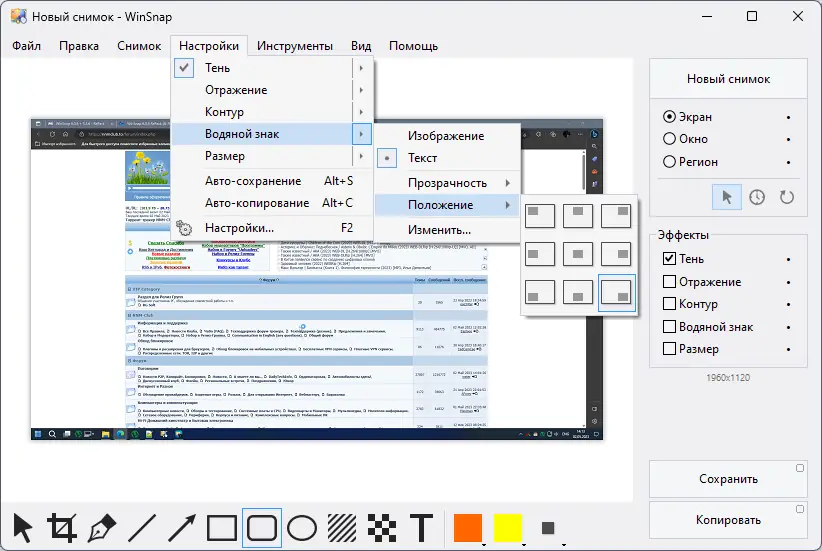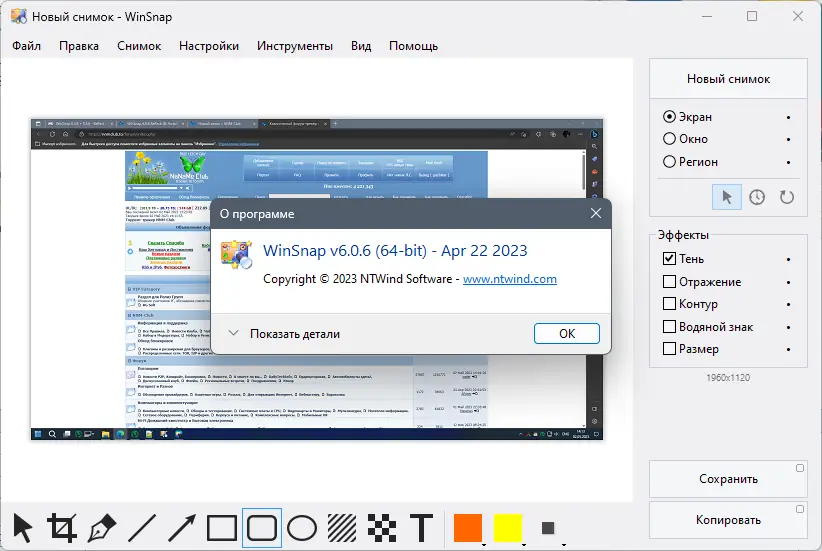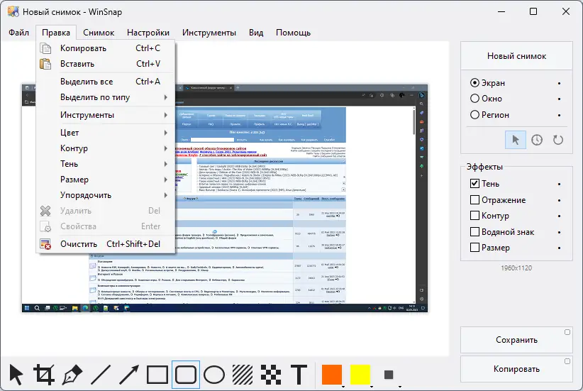 WinSnap — это компактное приложение для создания скриншотов с широкими возможностями постобработки. Программа поддерживает захват экрана в различных режимах, включая отдельные окна, рабочий стол, произвольные области и даже элементы с прозрачностью. Встроенные инструменты позволяют быстро редактировать изображения, применяя эффекты, изменяя фон, добавляя тени и масштабируя.
