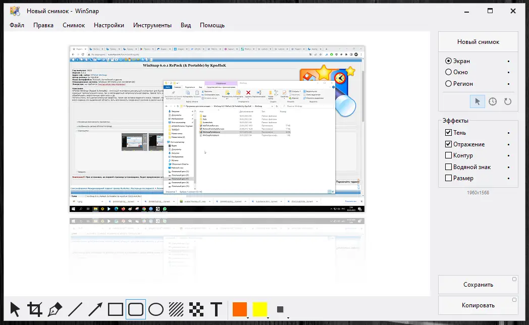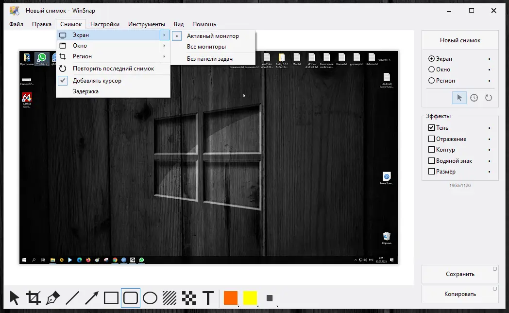 WinSnap — это компактное приложение для создания скриншотов с возможностью последующего редактирования изображений. Программа поддерживает захват экрана целиком, отдельных окон, нестандартных элементов интерфейса и выделенных областей. После снятия снимка доступны инструменты обработки: добавление теней, отражений, водяных знаков и автоматическое исправление цветового баланса.
